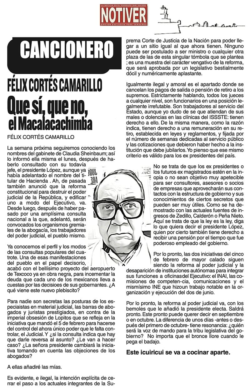 CANCIONERO | QUE SÍ, QUE NO, EL MACALACACHIMBA - La semana próxima seguiremos conociendo los nombres del gabinete de Claudia Sheinbaum; así lo informó ella misma el lunes, después de haberlo consultado...