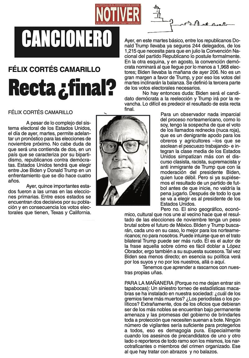 LAS COLUMNAS CANCIONERO | RECTA ¿FINAL? - A pesar de lo complejo del sistema electoral de los Estados Unidos, el día de ayer, martes, permite adelantar un pronóstico... RECTA ¿FINAL?.... 6 marzo 2024 Más Noticias LAS COSAS COMO SON | - MAS QUE UN DIARIO... TEXTO IRREVERENTE | LE VA A 'ECHAR GANITAS' - Al parecer, el asunto es 'chimoltrufiar' o sea lo mismo decir una cosa que otra. En marzo, el gobierno estatal informó que el programa de rehabilitación de carreteras y caminos conocido como "Bachetón"... ACERTIJOS | EL QUINTO PARTIDO - En la historia de los mundiales, México nunca ha jugado el quinto partido fuera de casa. Lo más que hemos alcanzado es el cuarto juego y de allí nos mandan a casa… A MIL POR HORA | - **Un matrimonio feliz **Apocalipsis jarocho **La isla de los pedófilos **“Amor con amor se paga”... A MIL POR HORA | - **Chicas más guapas **Días revolcados **Fascinantes artistas **Academia de Ególatras... CANCIONERO | EL PAN Y EL LLORO - Nada es accidental en la política. Este fin de semana, la señora presidente con A de patria tendrá una magna concentración de sus seguidores para celebrar el aniversario... TEXTO IRREVERENTE | ENNOCHEBUENADOS - La mercadotecnia adelanta todo y, ni modo, hay que lidiar con eso. Cuando todavía no acababa noviembre ya se vendían productos navideños y ahora mismo por doquiera se ven locales adornados con ese motivo... SIN TACTO | LAS VÍSPERAS - ¿Se acuerda la memorable lectora? ¿Recuerda el memorioso lector?: “Ya va llegando diciembre y sus posadas. Se va acercando ya también la Navidad. El año nuevo... LAS COSAS COMO SON - VAYA CINISMO... TEXTO IRREVERENTE | AÑO BUENO, AÑO MALO - El 2024 fue un año de suerte y abundancia. Este 2025 ha corrido en su contra con infortunio político y mediático. ¿‘Annus horribilis’? Tal vez no llega a tanto, pero sí desastroso y confirmatorio de sus...