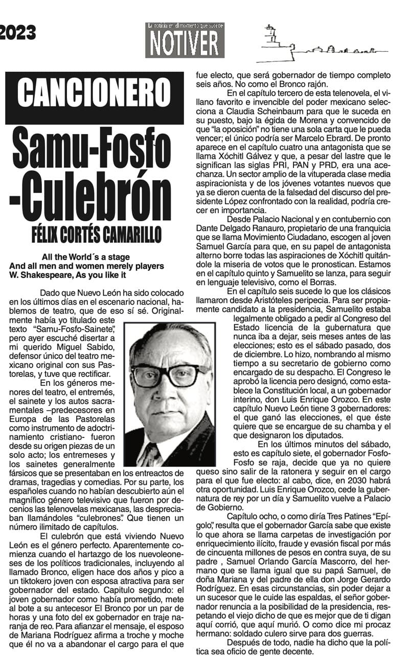 LAS COLUMNAS CANCIONERO - SAMU-FOSFO-CULEBRÓN SAMU-FOSFO-CULEBRÓN 5 diciembre 2023 Más Noticias LAS COSAS COMO SON | - MAS QUE UN DIARIO... TEXTO IRREVERENTE | LE VA A 'ECHAR GANITAS' - Al parecer, el asunto es 'chimoltrufiar' o sea lo mismo decir una cosa que otra. En marzo, el gobierno estatal informó que el programa de rehabilitación de carreteras y caminos conocido como "Bachetón"... ACERTIJOS | EL QUINTO PARTIDO - En la historia de los mundiales, México nunca ha jugado el quinto partido fuera de casa. Lo más que hemos alcanzado es el cuarto juego y de allí nos mandan a casa… A MIL POR HORA | - **Un matrimonio feliz **Apocalipsis jarocho **La isla de los pedófilos **“Amor con amor se paga”... A MIL POR HORA | - **Chicas más guapas **Días revolcados **Fascinantes artistas **Academia de Ególatras... CANCIONERO | EL PAN Y EL LLORO - Nada es accidental en la política. Este fin de semana, la señora presidente con A de patria tendrá una magna concentración de sus seguidores para celebrar el aniversario... TEXTO IRREVERENTE | ENNOCHEBUENADOS - La mercadotecnia adelanta todo y, ni modo, hay que lidiar con eso. Cuando todavía no acababa noviembre ya se vendían productos navideños y ahora mismo por doquiera se ven locales adornados con ese motivo... SIN TACTO | LAS VÍSPERAS - ¿Se acuerda la memorable lectora? ¿Recuerda el memorioso lector?: “Ya va llegando diciembre y sus posadas. Se va acercando ya también la Navidad. El año nuevo... LAS COSAS COMO SON - VAYA CINISMO... TEXTO IRREVERENTE | AÑO BUENO, AÑO MALO - El 2024 fue un año de suerte y abundancia. Este 2025 ha corrido en su contra con infortunio político y mediático. ¿‘Annus horribilis’? Tal vez no llega a tanto, pero sí desastroso y confirmatorio de sus...