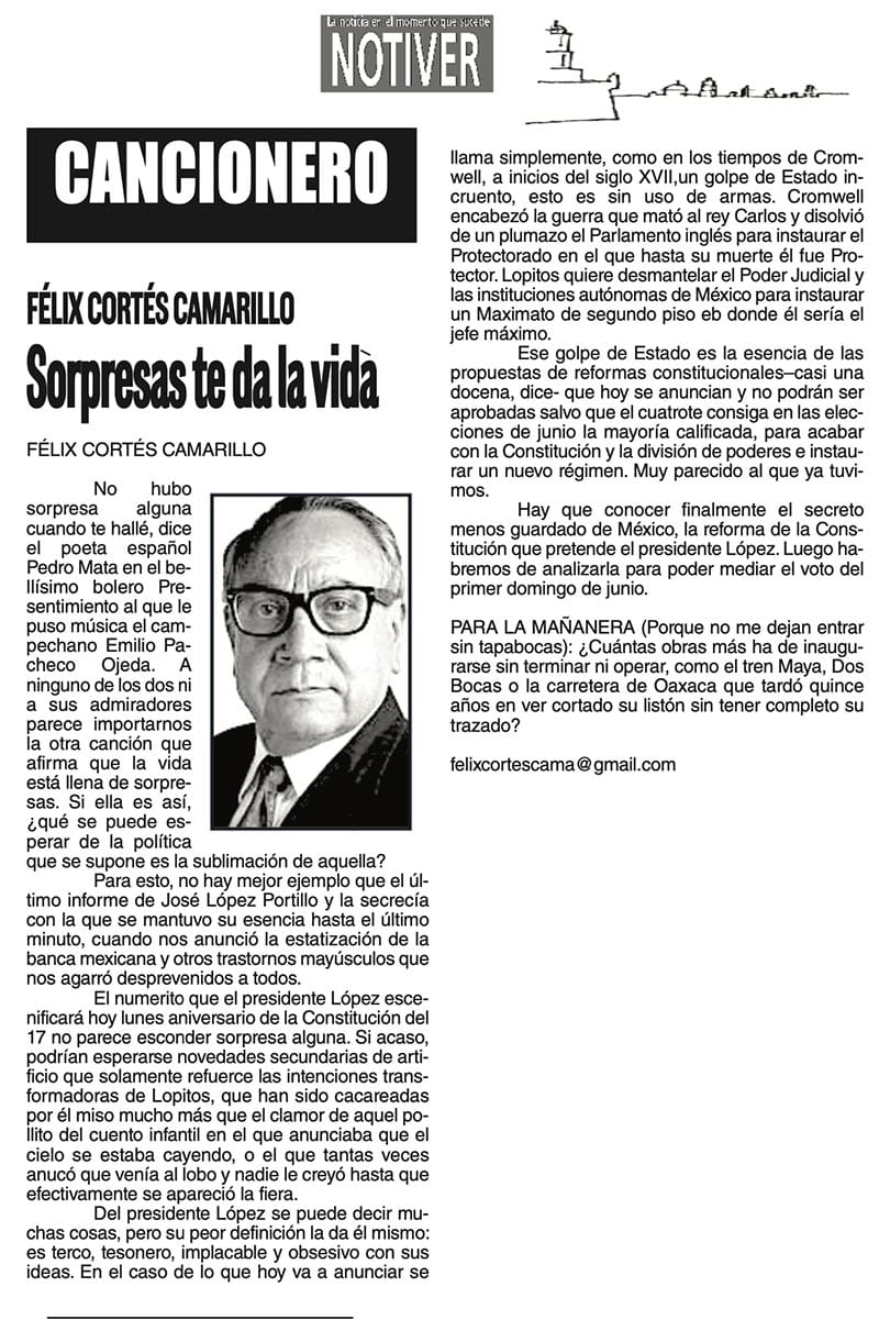 LAS COLUMNAS CANCIONERO - SORPRESAS TE DA LA VIDA- No hubo sorpresa alguna cuando te hallé, dice el poeta... SORPRESAS TE DA LA VIDA... 5 febrero 2024 Más Noticias LAS COSAS COMO SON | - MAS QUE UN DIARIO... TEXTO IRREVERENTE | LE VA A 'ECHAR GANITAS' - Al parecer, el asunto es 'chimoltrufiar' o sea lo mismo decir una cosa que otra. En marzo, el gobierno estatal informó que el programa de rehabilitación de carreteras y caminos conocido como "Bachetón"... ACERTIJOS | EL QUINTO PARTIDO - En la historia de los mundiales, México nunca ha jugado el quinto partido fuera de casa. Lo más que hemos alcanzado es el cuarto juego y de allí nos mandan a casa… A MIL POR HORA | - **Un matrimonio feliz **Apocalipsis jarocho **La isla de los pedófilos **“Amor con amor se paga”... A MIL POR HORA | - **Chicas más guapas **Días revolcados **Fascinantes artistas **Academia de Ególatras... CANCIONERO | EL PAN Y EL LLORO - Nada es accidental en la política. Este fin de semana, la señora presidente con A de patria tendrá una magna concentración de sus seguidores para celebrar el aniversario... TEXTO IRREVERENTE | ENNOCHEBUENADOS - La mercadotecnia adelanta todo y, ni modo, hay que lidiar con eso. Cuando todavía no acababa noviembre ya se vendían productos navideños y ahora mismo por doquiera se ven locales adornados con ese motivo... SIN TACTO | LAS VÍSPERAS - ¿Se acuerda la memorable lectora? ¿Recuerda el memorioso lector?: “Ya va llegando diciembre y sus posadas. Se va acercando ya también la Navidad. El año nuevo... LAS COSAS COMO SON - VAYA CINISMO... TEXTO IRREVERENTE | AÑO BUENO, AÑO MALO - El 2024 fue un año de suerte y abundancia. Este 2025 ha corrido en su contra con infortunio político y mediático. ¿‘Annus horribilis’? Tal vez no llega a tanto, pero sí desastroso y confirmatorio de sus...