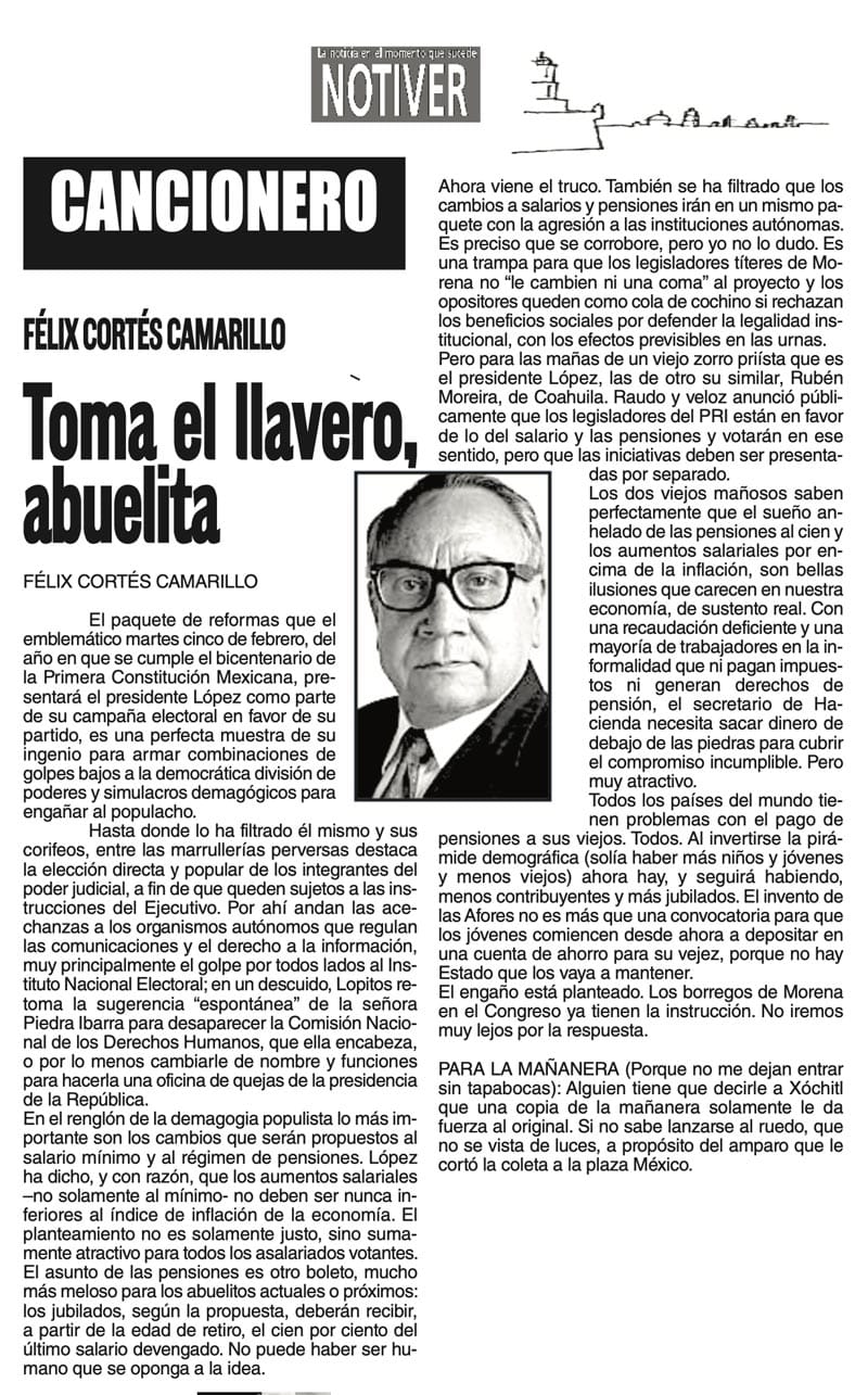 LAS COLUMNAS CANCIONERO - TOMA EL LLAVERO, ABUELITA- El paquete de reformas que el emblemático martes cinco de febrero... TOMA EL LLAVERO, ABUELITA... 1 febrero 2024 Más Noticias LAS COSAS COMO SON | - MAS QUE UN DIARIO... TEXTO IRREVERENTE | LE VA A 'ECHAR GANITAS' - Al parecer, el asunto es 'chimoltrufiar' o sea lo mismo decir una cosa que otra. En marzo, el gobierno estatal informó que el programa de rehabilitación de carreteras y caminos conocido como "Bachetón"... ACERTIJOS | EL QUINTO PARTIDO - En la historia de los mundiales, México nunca ha jugado el quinto partido fuera de casa. Lo más que hemos alcanzado es el cuarto juego y de allí nos mandan a casa… A MIL POR HORA | - **Un matrimonio feliz **Apocalipsis jarocho **La isla de los pedófilos **“Amor con amor se paga”... A MIL POR HORA | - **Chicas más guapas **Días revolcados **Fascinantes artistas **Academia de Ególatras... CANCIONERO | EL PAN Y EL LLORO - Nada es accidental en la política. Este fin de semana, la señora presidente con A de patria tendrá una magna concentración de sus seguidores para celebrar el aniversario... TEXTO IRREVERENTE | ENNOCHEBUENADOS - La mercadotecnia adelanta todo y, ni modo, hay que lidiar con eso. Cuando todavía no acababa noviembre ya se vendían productos navideños y ahora mismo por doquiera se ven locales adornados con ese motivo... SIN TACTO | LAS VÍSPERAS - ¿Se acuerda la memorable lectora? ¿Recuerda el memorioso lector?: “Ya va llegando diciembre y sus posadas. Se va acercando ya también la Navidad. El año nuevo... LAS COSAS COMO SON - VAYA CINISMO... TEXTO IRREVERENTE | AÑO BUENO, AÑO MALO - El 2024 fue un año de suerte y abundancia. Este 2025 ha corrido en su contra con infortunio político y mediático. ¿‘Annus horribilis’? Tal vez no llega a tanto, pero sí desastroso y confirmatorio de sus...