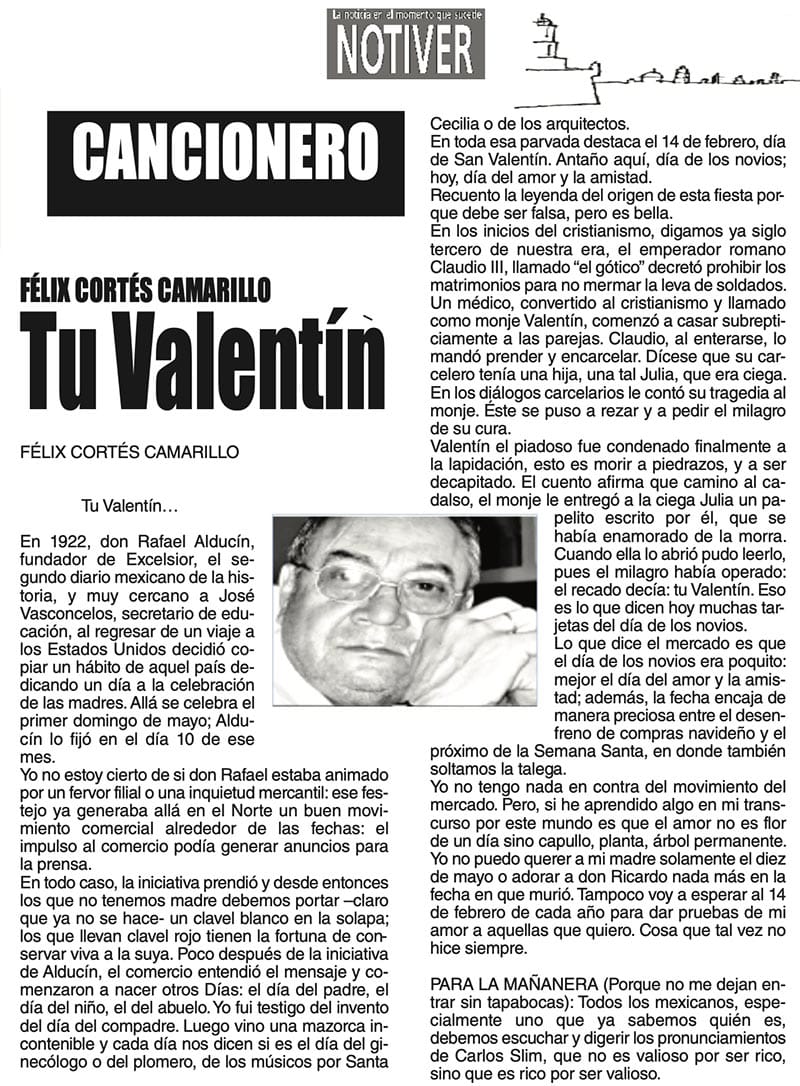 LAS COLUMNAS CANCIONERO | TU VALENTÍN - En 1922, don Rafael Alducín, fundador de Excelsior, el segundo diario mexicano de la historia, y muy cercano a José Vasconcelos... TU VALENTÍN... 14 febrero 2024 Más Noticias CANCIONERO | PIRATAS DEL CARIBE - A la pregunta de qué va a hacer con el petróleo que llevaba el barco tanque grandote llamado Skipper y con bandera falsa de Guyana, que sus fuerzas armadas... ACERTIJOS | LOS 51 AÑOS DE NOTIVER - Allá por los años 70s nacía Notiver. Un día Guadalupano por un asunto de festejo familiar. Desde aquel día de hace 51 años, que este 12 de diciembre se cumplen, el diario... TEXTO IRREVERENTE | - Monumental, mágico, misterioso y meritorio. Así definen arqueólogos y antropólogos a El Tajín, la ciudad prehispánica que se ubica cerca de Papantla, al norte veracruzano... A MIL POR HORA | - **Los duendes existen **Honrar al IMSS **Comadrita traviesa **Javier Duarte seguirá preso... TEXTO IRREVERENTE | CINCUENTA + UNO - La familia notiveriana está velando vísperas pues mañana es su fiesta magna, la que tiene lugar cada fin de otoño, ya pisando el invierno. El cumpleaños de NOTIVER comparte fecha... CANCIONERO | EL GOZO AL POZO...DE AGUA - Muy pronto se apagó el argüende mediático armado desde Palacio Nacional, en torno a la señora presidente con A de patria, celebrando con sonrisa pareja del primer ministro de Canadá, el bailoteo al ritmo de YMCA... SIN TACTO | 4T, LAS CUENTAS ALEGRES - Bueno, cuando menos podemos aceptar que los morenos en el poder tienen una capacidad: seguir al pie de la letra las instrucciones del librito que indica cómo responder y qué decir… ACERTIJOS | POR LOS 51 DE NOTIVER - Un día antes auguraban un gran Norte, que entró en lunes. Al iniciar semana. Cotidianamente llegó con mi hermano Enrique, con Fernando Pavón, biógrafo de Tierra Blanca y el amigo... 51 Y CONTANDO… | - Medio siglo y un año, no se escribe ni fácil ni sin derramar una que otra lagrimilla: 51 años de éste su periódico NOTIVER. La Noticia en el momento que sucede, es un acontecimiento más... A MIL POR HORA | - **Migrante exitoso **Genio universal **Manipulador de mujeres **Ley vs vapeadores...
