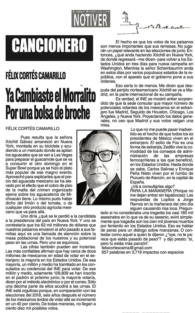 LAS COLUMNAS CANCIONERO - YA CAMBIASTE EL MORRALITO POR UNA BOLSA DE BROCHE YA CAMBIASTE EL MORRALITO POR UNA BOLSA DE BROCHE... 2 febrero 2024 Más Noticias LAS COSAS COMO SON | - MAS QUE UN DIARIO... TEXTO IRREVERENTE | LE VA A 'ECHAR GANITAS' - Al parecer, el asunto es 'chimoltrufiar' o sea lo mismo decir una cosa que otra. En marzo, el gobierno estatal informó que el programa de rehabilitación de carreteras y caminos conocido como "Bachetón"... ACERTIJOS | EL QUINTO PARTIDO - En la historia de los mundiales, México nunca ha jugado el quinto partido fuera de casa. Lo más que hemos alcanzado es el cuarto juego y de allí nos mandan a casa… A MIL POR HORA | - **Un matrimonio feliz **Apocalipsis jarocho **La isla de los pedófilos **“Amor con amor se paga”... A MIL POR HORA | - **Chicas más guapas **Días revolcados **Fascinantes artistas **Academia de Ególatras... CANCIONERO | EL PAN Y EL LLORO - Nada es accidental en la política. Este fin de semana, la señora presidente con A de patria tendrá una magna concentración de sus seguidores para celebrar el aniversario... TEXTO IRREVERENTE | ENNOCHEBUENADOS - La mercadotecnia adelanta todo y, ni modo, hay que lidiar con eso. Cuando todavía no acababa noviembre ya se vendían productos navideños y ahora mismo por doquiera se ven locales adornados con ese motivo... SIN TACTO | LAS VÍSPERAS - ¿Se acuerda la memorable lectora? ¿Recuerda el memorioso lector?: “Ya va llegando diciembre y sus posadas. Se va acercando ya también la Navidad. El año nuevo... LAS COSAS COMO SON - VAYA CINISMO... TEXTO IRREVERENTE | AÑO BUENO, AÑO MALO - El 2024 fue un año de suerte y abundancia. Este 2025 ha corrido en su contra con infortunio político y mediático. ¿‘Annus horribilis’? Tal vez no llega a tanto, pero sí desastroso y confirmatorio de sus...