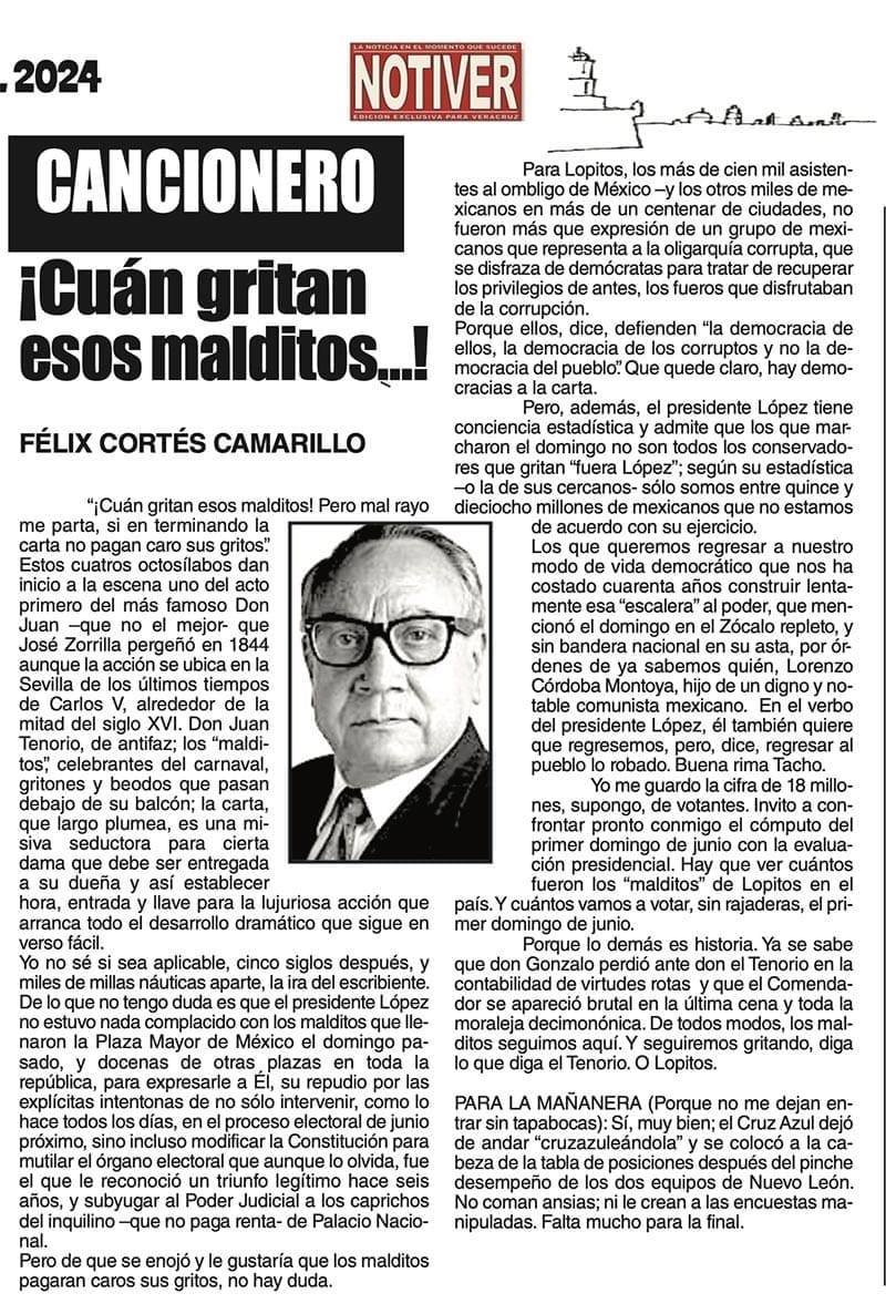 LAS COLUMNAS CANCIONERO | ¡CUÁN GRITAN ESOS MALDITOS...! - Pero mal rayo me parta, si en terminando la carta no pagan caro sus gritos". ¡CUÁN GRITAN ESOS MALDITOS...! 20 febrero 2024 Más Noticias TEXTO IRREVERENTE | HISTORIAS NECESARIAS - “Cuando Woody tenía 2 años en la guardería les dijeron a sus padres que algo estaba mal, no respondía a las instrucciones básicas. Las pruebas demostraron que era autista grave”. Luego “los médicos… A MIL POR HORA | - **Grandes ilusiones **Peores políticos **Empleos en Veracruz **En misión periodística A MIL POR HORA | - **Historia de 5 casadas **Lucha vs demonios **Dedazo Porfirista **El fut como el SIDA TEXTO IRREVERENTE | NO ES CÁNDIDA - La conversación pública en Veracruz se puso sino interesante al menos contestataria. Los que saben del asunto dividen a la conversación pública en tres espacios principales -no los únicos, pero sí los… ACERTIJOS | LAS PRIMAVERAS CANTORAS - Tengo un jardín bien cuidado, diario lo espío y el jardinero que es de La Perla, Joel, como si fuera de Versalles, lo tiene rechinando de limpio. Hace años me ha dado por darles de comer, antes les tiraba… CANCIONERO | LA TERMINOLOGÍA - En el principio era el Verbo, y el Verbo era Dios.Y el Verbo era con Dios. Lo sigue siendo: las cosas existen dependiendo de nuestra capacidad de darles nombre. La comunicación no existiría sin la convención de que… SIN TACTO | MÁS DE ZEPETA - Un amigo que gravita en el ámbito de Morena se comunica conmigo y me dice que le pareció apegado a la realidad política lo que publiqué en el “Sin tacto” de ayer sobre la suerte previsible de Esteban Ramírez Zepeta y su… CANCIONERO | EUTANASIA - Yo no tengo particular afecto por los animales llamados de compañía o mascotas, con las que seres solitarios procuran agenciarse afectos mediante el truco del perrito en el parque. Confieso que… A MIL POR HORA | - **Huérfanos mil niños **Hablar mal de Veracruz **Mesianismo jarocho **Fidel Castro en el café... SIN TACTO | SIGUE ZEPETA - En un despido que sigue el canon instaurado por la presidenta Claudia Sheinbaum, la dirigente nacional de Morena, Luisa María Alcalde Luján, fue invitada a ocupar la consejería jurídica de la Presidencia de la...