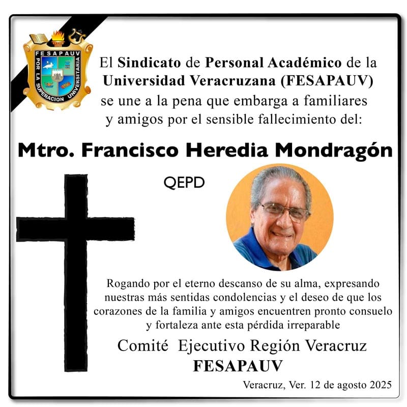 EL SINDICATO DE PERSONAL ACADÉMICO DE LA UNIVERSIDAD VERACRUZANA (FESAPAUV) SE UNE A LA PENA QUE EMBARGA A FAMILIARES Y AMIGOS POR EL SENSIBLE FALLECIMIENTO DEL: MTRO. FRANCISCO HEREDIA MONDRAGÓN