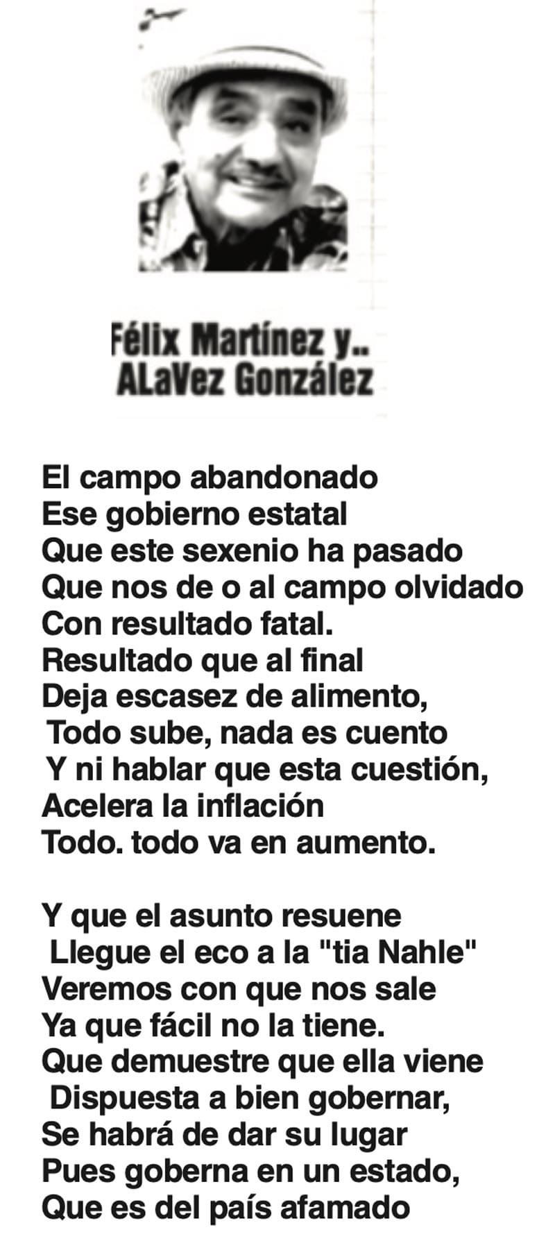 LAS COLUMNAS FÉLIX MARTINEZ Y… ALAVEZ GONZÁLEZ | - El campo abandonado... El campo abandonado... 14 enero 2025 Más Noticias A MIL POR HORA | - **Chicas más guapas **Días revolcados **Fascinantes artistas **Academia de Ególatras... CANCIONERO | EL PAN Y EL LLORO - Nada es accidental en la política. Este fin de semana, la señora presidente con A de patria tendrá una magna concentración de sus seguidores para celebrar el aniversario... TEXTO IRREVERENTE | ENNOCHEBUENADOS - La mercadotecnia adelanta todo y, ni modo, hay que lidiar con eso. Cuando todavía no acababa noviembre ya se vendían productos navideños y ahora mismo por doquiera se ven locales adornados con ese motivo... SIN TACTO | LAS VÍSPERAS - ¿Se acuerda la memorable lectora? ¿Recuerda el memorioso lector?: “Ya va llegando diciembre y sus posadas. Se va acercando ya también la Navidad. El año nuevo... LAS COSAS COMO SON - VAYA CINISMO... TEXTO IRREVERENTE | AÑO BUENO, AÑO MALO - El 2024 fue un año de suerte y abundancia. Este 2025 ha corrido en su contra con infortunio político y mediático. ¿‘Annus horribilis’? Tal vez no llega a tanto, pero sí desastroso y confirmatorio de sus... SIN TACTO | ¿PORRAS A NOROÑA? - El cada vez más impresentable y alocado Gerardo Fernández Noroña le hizo el dudoso honor y el muy flaco favor a la gobernadora Rocío Nahle… ACERTIJOS | - Decía un gran columnista, que aunque fuera día de celebración o de cumple o de lo que sea, nunca hay que dejar de teclear algo, para seguir activos. Hoy es mi cumple... CANCIONERO | EL FISCAL INCÓMODO - Nadie pudo imaginar que un incidente en el concurso de Miss Universo, esa feria machista de la carne y la lascivia, disfrazada del más pueril nacionalismo, fuera a… A MIL POR HORA | - **Un día feliz **Amores prohibidos **$350 mil de recompensas **La política más joven...