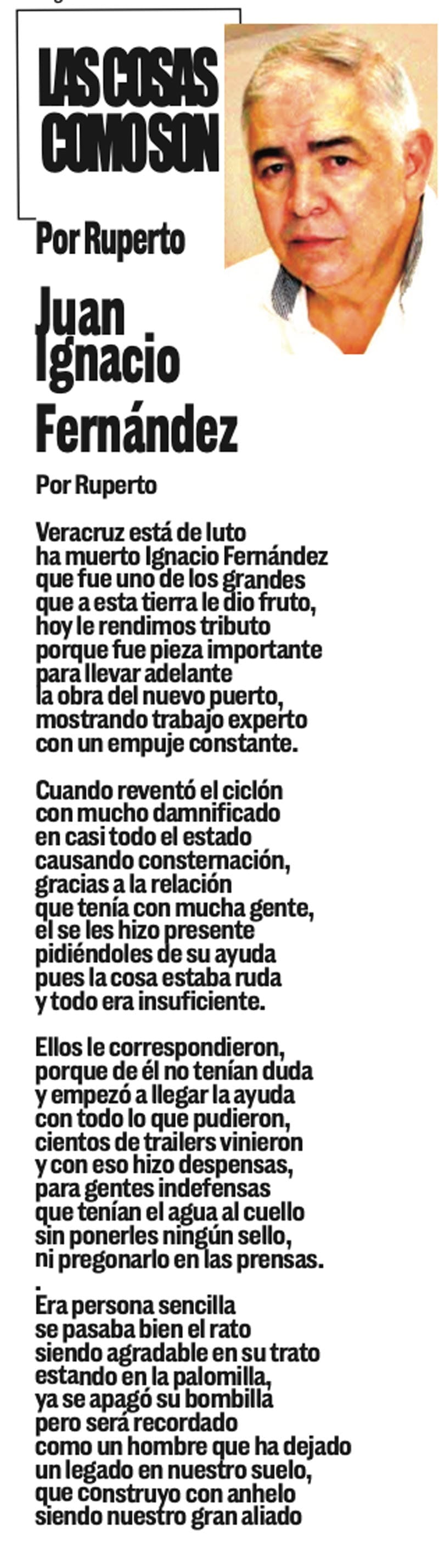 LAS COLUMNAS LAS COSAS COMO SON - JUAN IGNACIO FERNANDEZ JUAN IGNACIO FERNANDEZ... 10 noviembre 2025 Más Noticias TEXTO IRREVERENTE | HISTORIAS NECESARIAS - “Cuando Woody tenía 2 años en la guardería les dijeron a sus padres que algo estaba mal, no respondía a las instrucciones básicas. Las pruebas demostraron que era autista grave”. Luego “los médicos… A MIL POR HORA | - **Grandes ilusiones **Peores políticos **Empleos en Veracruz **En misión periodística A MIL POR HORA | - **Historia de 5 casadas **Lucha vs demonios **Dedazo Porfirista **El fut como el SIDA TEXTO IRREVERENTE | NO ES CÁNDIDA - La conversación pública en Veracruz se puso sino interesante al menos contestataria. Los que saben del asunto dividen a la conversación pública en tres espacios principales -no los únicos, pero sí los… ACERTIJOS | LAS PRIMAVERAS CANTORAS - Tengo un jardín bien cuidado, diario lo espío y el jardinero que es de La Perla, Joel, como si fuera de Versalles, lo tiene rechinando de limpio. Hace años me ha dado por darles de comer, antes les tiraba… CANCIONERO | LA TERMINOLOGÍA - En el principio era el Verbo, y el Verbo era Dios.Y el Verbo era con Dios. Lo sigue siendo: las cosas existen dependiendo de nuestra capacidad de darles nombre. La comunicación no existiría sin la convención de que… SIN TACTO | MÁS DE ZEPETA - Un amigo que gravita en el ámbito de Morena se comunica conmigo y me dice que le pareció apegado a la realidad política lo que publiqué en el “Sin tacto” de ayer sobre la suerte previsible de Esteban Ramírez Zepeta y su… CANCIONERO | EUTANASIA - Yo no tengo particular afecto por los animales llamados de compañía o mascotas, con las que seres solitarios procuran agenciarse afectos mediante el truco del perrito en el parque. Confieso que… A MIL POR HORA | - **Huérfanos mil niños **Hablar mal de Veracruz **Mesianismo jarocho **Fidel Castro en el café... SIN TACTO | SIGUE ZEPETA - En un despido que sigue el canon instaurado por la presidenta Claudia Sheinbaum, la dirigente nacional de Morena, Luisa María Alcalde Luján, fue invitada a ocupar la consejería jurídica de la Presidencia de la...