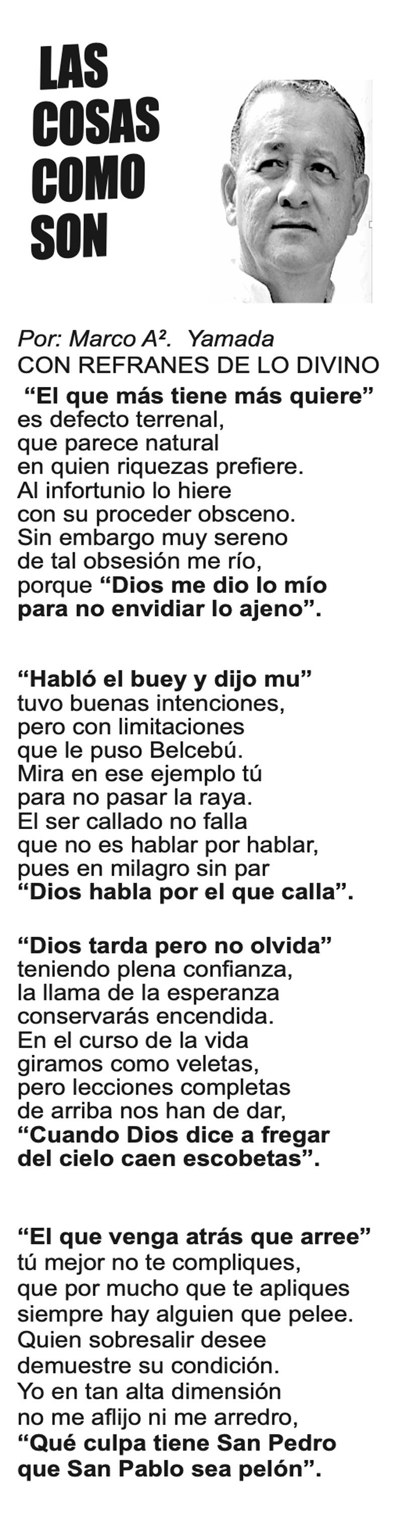 LAS COLUMNAS LAS COSAS COMO SON... CON REFRANES DE LO DIVINO... 7 septiembre 2023 Más Noticias LAS COSAS COMO SON | - MAS QUE UN DIARIO... TEXTO IRREVERENTE | LE VA A 'ECHAR GANITAS' - Al parecer, el asunto es 'chimoltrufiar' o sea lo mismo decir una cosa que otra. En marzo, el gobierno estatal informó que el programa de rehabilitación de carreteras y caminos conocido como "Bachetón"... ACERTIJOS | EL QUINTO PARTIDO - En la historia de los mundiales, México nunca ha jugado el quinto partido fuera de casa. Lo más que hemos alcanzado es el cuarto juego y de allí nos mandan a casa… A MIL POR HORA | - **Un matrimonio feliz **Apocalipsis jarocho **La isla de los pedófilos **“Amor con amor se paga”... A MIL POR HORA | - **Chicas más guapas **Días revolcados **Fascinantes artistas **Academia de Ególatras... CANCIONERO | EL PAN Y EL LLORO - Nada es accidental en la política. Este fin de semana, la señora presidente con A de patria tendrá una magna concentración de sus seguidores para celebrar el aniversario... TEXTO IRREVERENTE | ENNOCHEBUENADOS - La mercadotecnia adelanta todo y, ni modo, hay que lidiar con eso. Cuando todavía no acababa noviembre ya se vendían productos navideños y ahora mismo por doquiera se ven locales adornados con ese motivo... SIN TACTO | LAS VÍSPERAS - ¿Se acuerda la memorable lectora? ¿Recuerda el memorioso lector?: “Ya va llegando diciembre y sus posadas. Se va acercando ya también la Navidad. El año nuevo... LAS COSAS COMO SON - VAYA CINISMO... TEXTO IRREVERENTE | AÑO BUENO, AÑO MALO - El 2024 fue un año de suerte y abundancia. Este 2025 ha corrido en su contra con infortunio político y mediático. ¿‘Annus horribilis’? Tal vez no llega a tanto, pero sí desastroso y confirmatorio de sus...