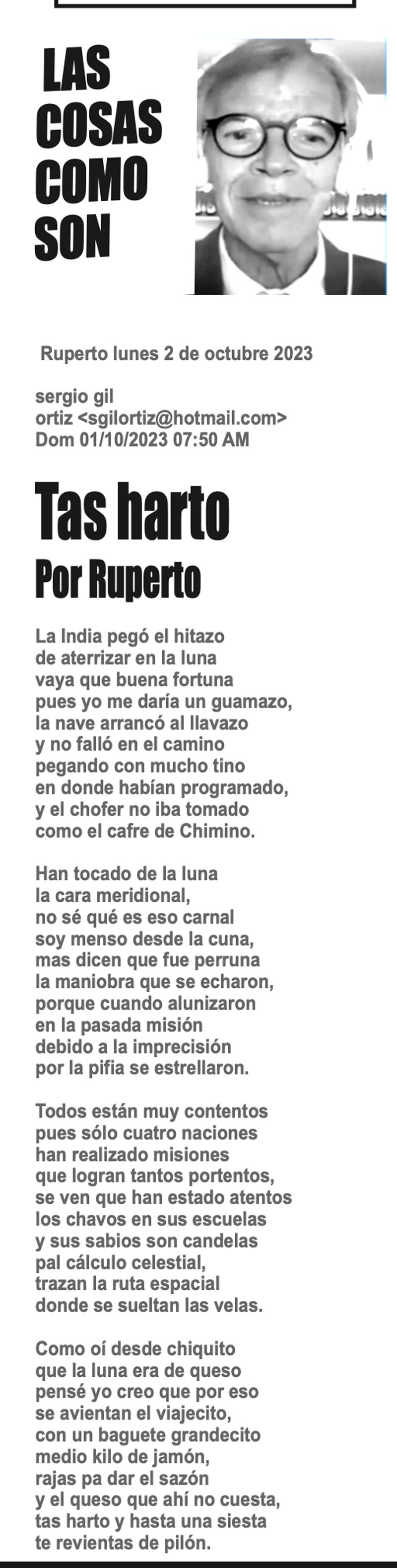 LAS COLUMNAS LAS COSAS COMO SON... TAS HARTO... 2 octubre 2023 Más Noticias LAS COSAS COMO SON | - MAS QUE UN DIARIO... TEXTO IRREVERENTE | LE VA A 'ECHAR GANITAS' - Al parecer, el asunto es 'chimoltrufiar' o sea lo mismo decir una cosa que otra. En marzo, el gobierno estatal informó que el programa de rehabilitación de carreteras y caminos conocido como "Bachetón"... ACERTIJOS | EL QUINTO PARTIDO - En la historia de los mundiales, México nunca ha jugado el quinto partido fuera de casa. Lo más que hemos alcanzado es el cuarto juego y de allí nos mandan a casa… A MIL POR HORA | - **Un matrimonio feliz **Apocalipsis jarocho **La isla de los pedófilos **“Amor con amor se paga”... A MIL POR HORA | - **Chicas más guapas **Días revolcados **Fascinantes artistas **Academia de Ególatras... CANCIONERO | EL PAN Y EL LLORO - Nada es accidental en la política. Este fin de semana, la señora presidente con A de patria tendrá una magna concentración de sus seguidores para celebrar el aniversario... TEXTO IRREVERENTE | ENNOCHEBUENADOS - La mercadotecnia adelanta todo y, ni modo, hay que lidiar con eso. Cuando todavía no acababa noviembre ya se vendían productos navideños y ahora mismo por doquiera se ven locales adornados con ese motivo... SIN TACTO | LAS VÍSPERAS - ¿Se acuerda la memorable lectora? ¿Recuerda el memorioso lector?: “Ya va llegando diciembre y sus posadas. Se va acercando ya también la Navidad. El año nuevo... LAS COSAS COMO SON - VAYA CINISMO... TEXTO IRREVERENTE | AÑO BUENO, AÑO MALO - El 2024 fue un año de suerte y abundancia. Este 2025 ha corrido en su contra con infortunio político y mediático. ¿‘Annus horribilis’? Tal vez no llega a tanto, pero sí desastroso y confirmatorio de sus...