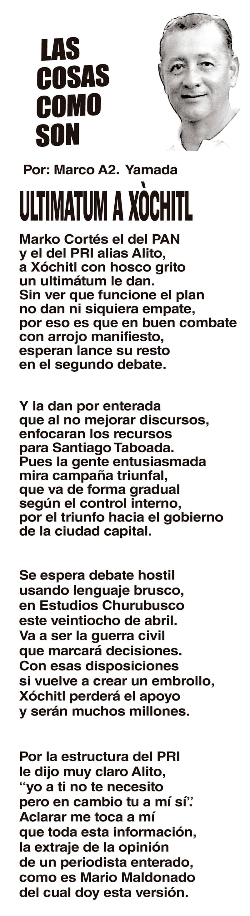 LAS COLUMNAS LAS COSAS COMO SON | - ULTIMATUM A XÓCHITL ULTIMATUM A XÓCHITL... 18 abril 2024 Más Noticias LAS COSAS COMO SON | - MAS QUE UN DIARIO... TEXTO IRREVERENTE | LE VA A 'ECHAR GANITAS' - Al parecer, el asunto es 'chimoltrufiar' o sea lo mismo decir una cosa que otra. En marzo, el gobierno estatal informó que el programa de rehabilitación de carreteras y caminos conocido como "Bachetón"... ACERTIJOS | EL QUINTO PARTIDO - En la historia de los mundiales, México nunca ha jugado el quinto partido fuera de casa. Lo más que hemos alcanzado es el cuarto juego y de allí nos mandan a casa… A MIL POR HORA | - **Un matrimonio feliz **Apocalipsis jarocho **La isla de los pedófilos **“Amor con amor se paga”... A MIL POR HORA | - **Chicas más guapas **Días revolcados **Fascinantes artistas **Academia de Ególatras... CANCIONERO | EL PAN Y EL LLORO - Nada es accidental en la política. Este fin de semana, la señora presidente con A de patria tendrá una magna concentración de sus seguidores para celebrar el aniversario... TEXTO IRREVERENTE | ENNOCHEBUENADOS - La mercadotecnia adelanta todo y, ni modo, hay que lidiar con eso. Cuando todavía no acababa noviembre ya se vendían productos navideños y ahora mismo por doquiera se ven locales adornados con ese motivo... SIN TACTO | LAS VÍSPERAS - ¿Se acuerda la memorable lectora? ¿Recuerda el memorioso lector?: “Ya va llegando diciembre y sus posadas. Se va acercando ya también la Navidad. El año nuevo... LAS COSAS COMO SON - VAYA CINISMO... TEXTO IRREVERENTE | AÑO BUENO, AÑO MALO - El 2024 fue un año de suerte y abundancia. Este 2025 ha corrido en su contra con infortunio político y mediático. ¿‘Annus horribilis’? Tal vez no llega a tanto, pero sí desastroso y confirmatorio de sus...