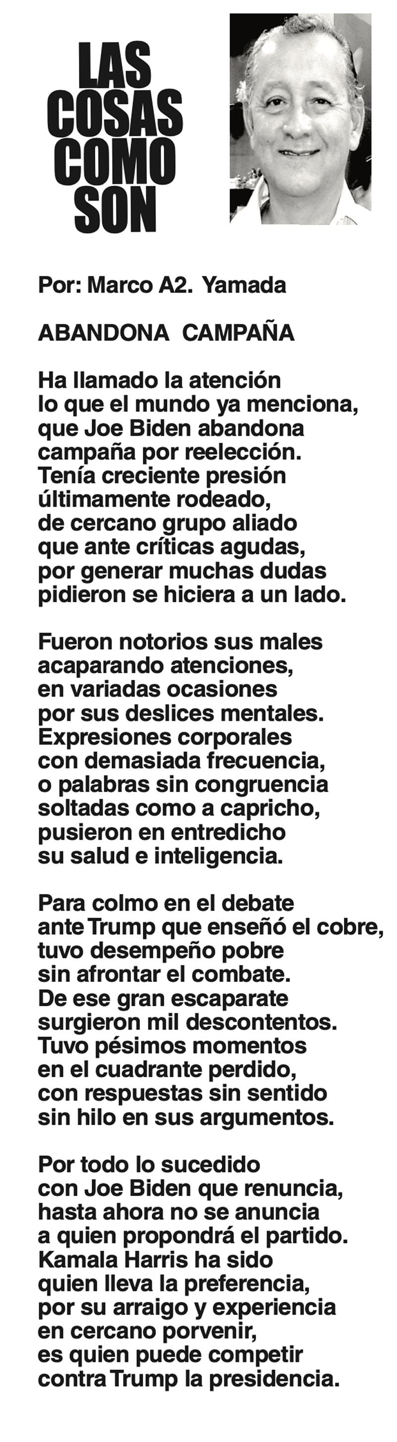 LAS COLUMNAS LAS COSAS COMO SON | - ABANDONA CAMPAÑA ABANDONA CAMPAÑA... 23 julio 2024 Más Noticias LAS COSAS COMO SON | - MAS QUE UN DIARIO... TEXTO IRREVERENTE | LE VA A 'ECHAR GANITAS' - Al parecer, el asunto es 'chimoltrufiar' o sea lo mismo decir una cosa que otra. En marzo, el gobierno estatal informó que el programa de rehabilitación de carreteras y caminos conocido como "Bachetón"... ACERTIJOS | EL QUINTO PARTIDO - En la historia de los mundiales, México nunca ha jugado el quinto partido fuera de casa. Lo más que hemos alcanzado es el cuarto juego y de allí nos mandan a casa… A MIL POR HORA | - **Un matrimonio feliz **Apocalipsis jarocho **La isla de los pedófilos **“Amor con amor se paga”... A MIL POR HORA | - **Chicas más guapas **Días revolcados **Fascinantes artistas **Academia de Ególatras... CANCIONERO | EL PAN Y EL LLORO - Nada es accidental en la política. Este fin de semana, la señora presidente con A de patria tendrá una magna concentración de sus seguidores para celebrar el aniversario... TEXTO IRREVERENTE | ENNOCHEBUENADOS - La mercadotecnia adelanta todo y, ni modo, hay que lidiar con eso. Cuando todavía no acababa noviembre ya se vendían productos navideños y ahora mismo por doquiera se ven locales adornados con ese motivo... SIN TACTO | LAS VÍSPERAS - ¿Se acuerda la memorable lectora? ¿Recuerda el memorioso lector?: “Ya va llegando diciembre y sus posadas. Se va acercando ya también la Navidad. El año nuevo... LAS COSAS COMO SON - VAYA CINISMO... TEXTO IRREVERENTE | AÑO BUENO, AÑO MALO - El 2024 fue un año de suerte y abundancia. Este 2025 ha corrido en su contra con infortunio político y mediático. ¿‘Annus horribilis’? Tal vez no llega a tanto, pero sí desastroso y confirmatorio de sus...
