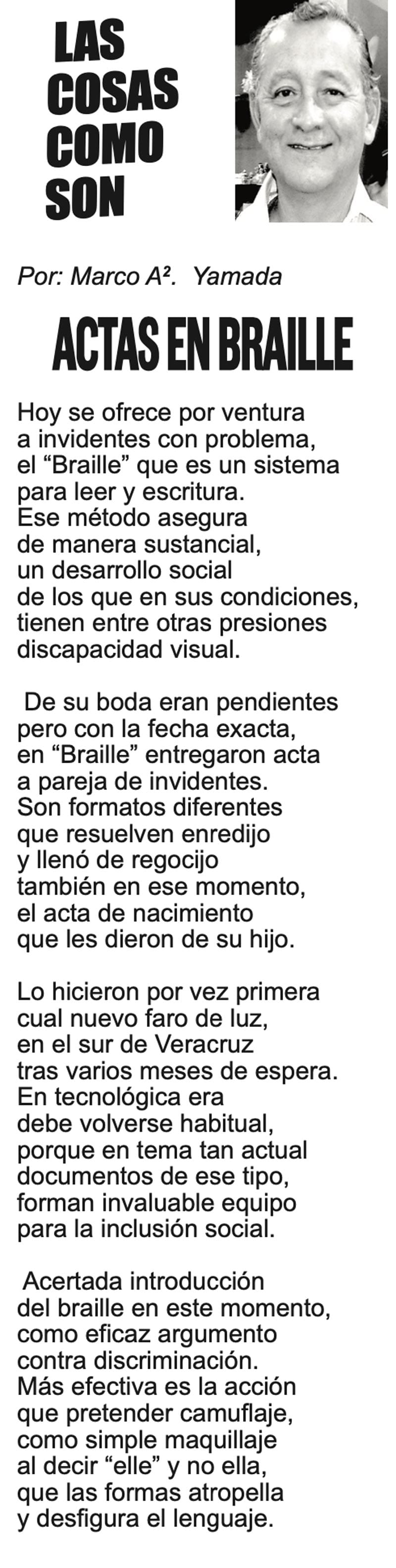 LAS COLUMNAS LAS COSAS COMO SON - ACTAS EN BRAILLE ACTAS EN BRAILLE... 1 febrero 2024 Más Noticias TEXTO IRREVERENTE | UN ARTE ETERNO - Envejecer haciendo periodismo no es sinónimo de obsolescencia ni de ser retardatario. La llamada ‘vieja guardia’ de la reporteada y del análisis periodístico... DIARIO DE UN REPORTERO | Y TODO ¿PARA QUÉ? - Tres días estuvo cerrado el centro de Xalapa porque se preparaba el escenario para el primer informe de la gobernadora Rocío Nahle. El tránsito... ACERTIJOS | NACEN LOS RIVALES EN FIFA - Es la mañana del sorteo de FIFA, en Washington, que amanece con un frio del carajo a 2 grados bajo cero y con caída de nieve. Llegan al Kennedy Center… A MIL POR HORA | - **5 películas icónicas **Seniles: bailar en casa **Marilyn y Chanel 5 **Sabroso quesito fundido... LAS COSAS COMO SON | - MAS QUE UN DIARIO... TEXTO IRREVERENTE | LE VA A 'ECHAR GANITAS' - Al parecer, el asunto es 'chimoltrufiar' o sea lo mismo decir una cosa que otra. En marzo, el gobierno estatal informó que el programa de rehabilitación de carreteras y caminos conocido como "Bachetón"... ACERTIJOS | EL QUINTO PARTIDO - En la historia de los mundiales, México nunca ha jugado el quinto partido fuera de casa. Lo más que hemos alcanzado es el cuarto juego y de allí nos mandan a casa… A MIL POR HORA | - **Un matrimonio feliz **Apocalipsis jarocho **La isla de los pedófilos **“Amor con amor se paga”... A MIL POR HORA | - **Chicas más guapas **Días revolcados **Fascinantes artistas **Academia de Ególatras... CANCIONERO | EL PAN Y EL LLORO - Nada es accidental en la política. Este fin de semana, la señora presidente con A de patria tendrá una magna concentración de sus seguidores para celebrar el aniversario...