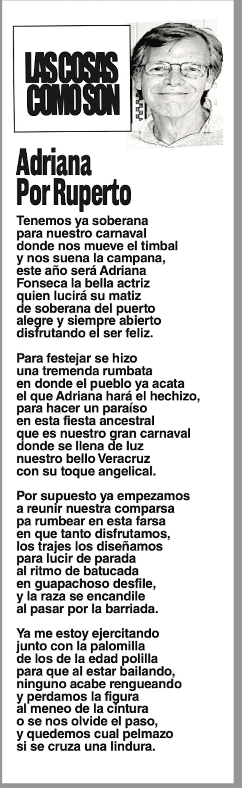 LAS COLUMNAS LAS COSAS COMO SON | - ADRIANA LAS COSAS COMO SON | - ADRIANA 14 abril 2025 Más Noticias CANCIONERO | CANDIL DE LA CALLE - Ya corrió bastante tinta, inclusive en este espacio, reconociendo la simplemente digna conducta de la señora presidente con A de mujer durante sus muy publicitadas apariciones en su breve visita a Barcelona y... ACERTIJOS | DOS MUJERES. DOS PASIONES - Dos mujeres que piensan diferente y que, quizá estarán en trincheras opositoras. Una ya gobierna un país grande, México, la otra va a ser pronto la presidenta de Venezuela, en cuanto se ponga más quieto aquel... TEXTO IRREVERENTE | EN TRES ACTOS - Primer acto. Miguel Ángel Anaya Castillo, periodista independiente y dueño del portal informativo “Pánuco On Line” incomoda al poder municipal por reportar los abusos de poder y andanas insanas del alcalde… A MIL POR HORA | - **El mundo animal… **Retrato de Veracruz **Jarocho de Jack London **Lo mejor y peor del día... SIN TACTO | LA BRONCA EN SALUD ESTATAL - Son 26 mil trabajadores los que tiene en Veracruz el sector Salud y son ellos mismos los que están en un movimiento activo para exigir sus derechos no cumplidos y que se ponga la atención debida a los servicios... SIN TACTO | DEMENCIA SENIL - Hay una enfermedad mórbida en México que nos afecta de una manera que por lo general no se quiere reconocer. Es el Síndrome de Demencia Senil (SDS), que en México padecen un millón 300 mil personas, cerca... ACERTIJOS | JOSERRA EL PROTAGONISTA - La semana estuvo llena de protagonismos, uno de ellos José Ramón Fernández, el gran Joserra, quien presentó su libro que ahí voy leyendo a medias y que pronto comentaré. Tuvo tantos y tan buenos invitados, que... CANCIONERO | Las carambolas de Barcelona - Yo no sé de quién fue la idea, sospecho que de los estrategas de Pedro Sánchez, quién junto con la señora presidente con A de mujer Claudia Sheinbaum, son los únicos que pueden llamarse ganadores... TEXTO IRREVERENTE | EMBARCADOS - El barco fantasma, inventado por la zacatecana Rocío Nahle, nunca existió. Tampoco las chapopoteras naturales generaron el derrame de petróleo que manchó 900 kilómetros en el litoral... A MIL POR HORA | - **Diario de la muerte **Mil niños huérfanos **Tiros en la madrugada **Recuento de daños