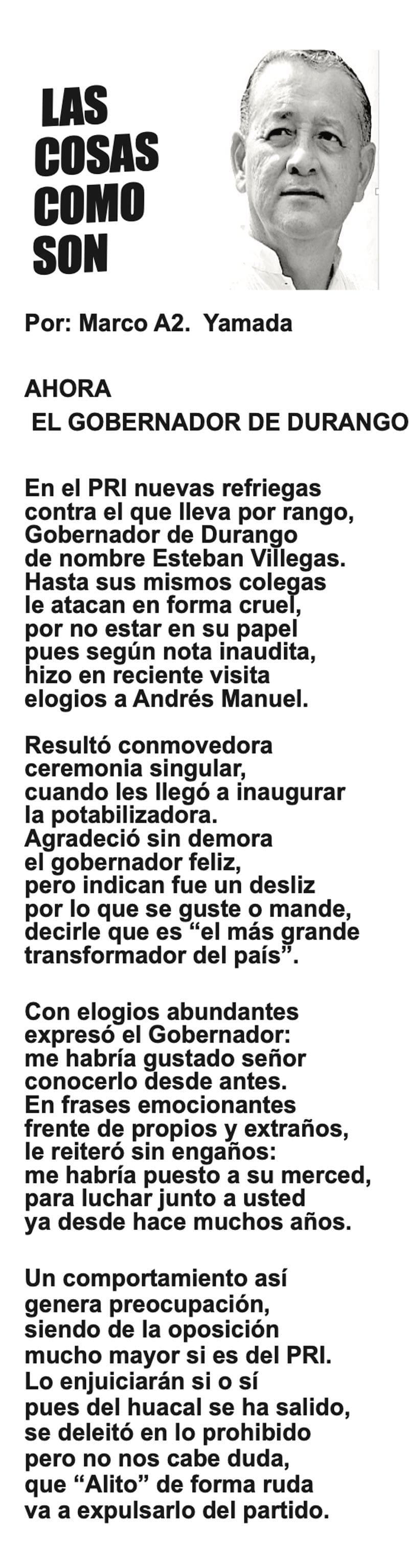 LAS COLUMNAS LAS COSAS COMO SON - AHORA EL GOBERNADOR DE DURANGO AHORA EL GOBERNADOR DE DURANGO... 30 enero 2024 Más Noticias LAS COSAS COMO SON | - MAS QUE UN DIARIO... TEXTO IRREVERENTE | LE VA A 'ECHAR GANITAS' - Al parecer, el asunto es 'chimoltrufiar' o sea lo mismo decir una cosa que otra. En marzo, el gobierno estatal informó que el programa de rehabilitación de carreteras y caminos conocido como "Bachetón"... ACERTIJOS | EL QUINTO PARTIDO - En la historia de los mundiales, México nunca ha jugado el quinto partido fuera de casa. Lo más que hemos alcanzado es el cuarto juego y de allí nos mandan a casa… A MIL POR HORA | - **Un matrimonio feliz **Apocalipsis jarocho **La isla de los pedófilos **“Amor con amor se paga”... A MIL POR HORA | - **Chicas más guapas **Días revolcados **Fascinantes artistas **Academia de Ególatras... CANCIONERO | EL PAN Y EL LLORO - Nada es accidental en la política. Este fin de semana, la señora presidente con A de patria tendrá una magna concentración de sus seguidores para celebrar el aniversario... TEXTO IRREVERENTE | ENNOCHEBUENADOS - La mercadotecnia adelanta todo y, ni modo, hay que lidiar con eso. Cuando todavía no acababa noviembre ya se vendían productos navideños y ahora mismo por doquiera se ven locales adornados con ese motivo... SIN TACTO | LAS VÍSPERAS - ¿Se acuerda la memorable lectora? ¿Recuerda el memorioso lector?: “Ya va llegando diciembre y sus posadas. Se va acercando ya también la Navidad. El año nuevo... LAS COSAS COMO SON - VAYA CINISMO... TEXTO IRREVERENTE | AÑO BUENO, AÑO MALO - El 2024 fue un año de suerte y abundancia. Este 2025 ha corrido en su contra con infortunio político y mediático. ¿‘Annus horribilis’? Tal vez no llega a tanto, pero sí desastroso y confirmatorio de sus...