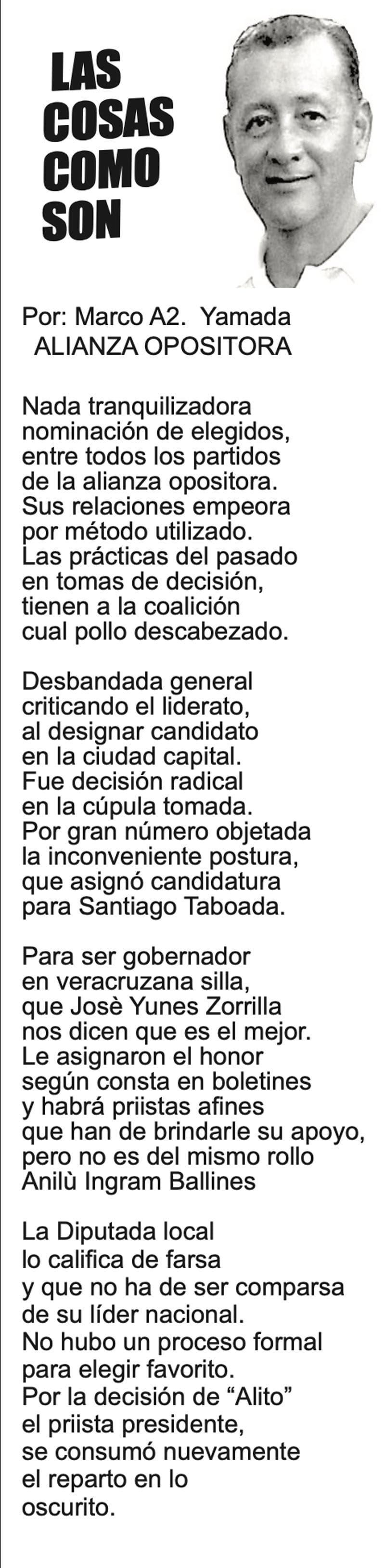 LAS COLUMNAS LAS COSAS COMO SON - ALIANZA OPOSITORA ALIANZA OPOSITORA... 28 noviembre 2023 Más Noticias A MIL POR HORA | - **Historia de 5 casadas **Lucha vs demonios **Dedazo Porfirista **El fut como el SIDA TEXTO IRREVERENTE | NO ES CÁNDIDA - La conversación pública en Veracruz se puso sino interesante al menos contestataria. Los que saben del asunto dividen a la conversación pública en tres espacios principales -no los únicos, pero sí los… ACERTIJOS | LAS PRIMAVERAS CANTORAS - Tengo un jardín bien cuidado, diario lo espío y el jardinero que es de La Perla, Joel, como si fuera de Versalles, lo tiene rechinando de limpio. Hace años me ha dado por darles de comer, antes les tiraba… CANCIONERO | LA TERMINOLOGÍA - En el principio era el Verbo, y el Verbo era Dios.Y el Verbo era con Dios. Lo sigue siendo: las cosas existen dependiendo de nuestra capacidad de darles nombre. La comunicación no existiría sin la convención de que… SIN TACTO | MÁS DE ZEPETA - Un amigo que gravita en el ámbito de Morena se comunica conmigo y me dice que le pareció apegado a la realidad política lo que publiqué en el “Sin tacto” de ayer sobre la suerte previsible de Esteban Ramírez Zepeta y su… CANCIONERO | EUTANASIA - Yo no tengo particular afecto por los animales llamados de compañía o mascotas, con las que seres solitarios procuran agenciarse afectos mediante el truco del perrito en el parque. Confieso que… A MIL POR HORA | - **Huérfanos mil niños **Hablar mal de Veracruz **Mesianismo jarocho **Fidel Castro en el café... SIN TACTO | SIGUE ZEPETA - En un despido que sigue el canon instaurado por la presidenta Claudia Sheinbaum, la dirigente nacional de Morena, Luisa María Alcalde Luján, fue invitada a ocupar la consejería jurídica de la Presidencia de la... TEXTO IRREVERENTE | ABRAZO FRATERNO - “Dios traerá con Jesús a los que se durmieron en Él” (1 Tesalonicenses 4:13). Desde acá va un abrazo solidario y fraterno para el periodista Luis Velásquez Rivera por la partida de su hermano... ACERTIJOS | LOS TIROTEOS EN LA TELE - Si uno llegara a conocer un nuevo país, suponiendo México, y comenzara a conocerlo y encendiera la tele para revisar el noticiero nocturno, qué bárbaro, pensarían que estamos en un campo de guerra y batalla...