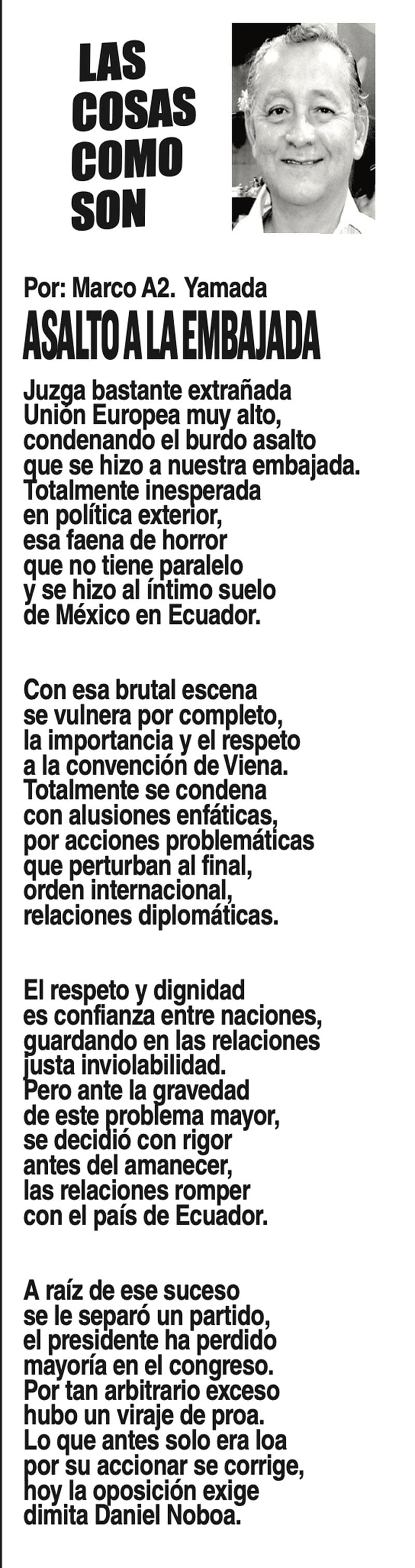 LAS COLUMNAS LAS COSAS COMO SON - | ASALTO A LA EMBAJADA 9 abril 2024 Más Noticias LAS COSAS COMO SON | - MAS QUE UN DIARIO... TEXTO IRREVERENTE | LE VA A 'ECHAR GANITAS' - Al parecer, el asunto es 'chimoltrufiar' o sea lo mismo decir una cosa que otra. En marzo, el gobierno estatal informó que el programa de rehabilitación de carreteras y caminos conocido como "Bachetón"... ACERTIJOS | EL QUINTO PARTIDO - En la historia de los mundiales, México nunca ha jugado el quinto partido fuera de casa. Lo más que hemos alcanzado es el cuarto juego y de allí nos mandan a casa… A MIL POR HORA | - **Un matrimonio feliz **Apocalipsis jarocho **La isla de los pedófilos **“Amor con amor se paga”... A MIL POR HORA | - **Chicas más guapas **Días revolcados **Fascinantes artistas **Academia de Ególatras... CANCIONERO | EL PAN Y EL LLORO - Nada es accidental en la política. Este fin de semana, la señora presidente con A de patria tendrá una magna concentración de sus seguidores para celebrar el aniversario... TEXTO IRREVERENTE | ENNOCHEBUENADOS - La mercadotecnia adelanta todo y, ni modo, hay que lidiar con eso. Cuando todavía no acababa noviembre ya se vendían productos navideños y ahora mismo por doquiera se ven locales adornados con ese motivo... SIN TACTO | LAS VÍSPERAS - ¿Se acuerda la memorable lectora? ¿Recuerda el memorioso lector?: “Ya va llegando diciembre y sus posadas. Se va acercando ya también la Navidad. El año nuevo... LAS COSAS COMO SON - VAYA CINISMO... TEXTO IRREVERENTE | AÑO BUENO, AÑO MALO - El 2024 fue un año de suerte y abundancia. Este 2025 ha corrido en su contra con infortunio político y mediático. ¿‘Annus horribilis’? Tal vez no llega a tanto, pero sí desastroso y confirmatorio de sus...