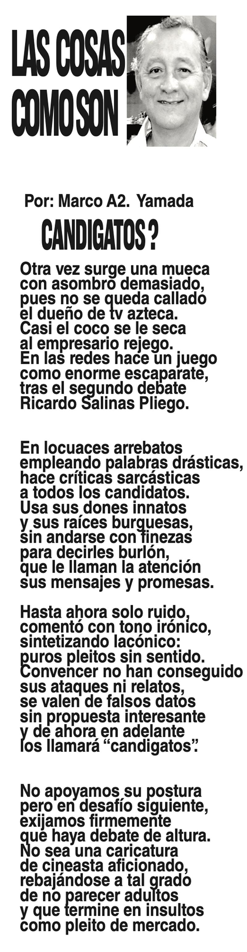 LAS COLUMNAS LAS COSAS COMO SON | - CANDIGATOS? CANDIGATOS?... 30 abril 2024 Más Noticias TEXTO IRREVERENTE | HISTORIAS NECESARIAS - “Cuando Woody tenía 2 años en la guardería les dijeron a sus padres que algo estaba mal, no respondía a las instrucciones básicas. Las pruebas demostraron que era autista grave”. Luego “los médicos… A MIL POR HORA | - **Grandes ilusiones **Peores políticos **Empleos en Veracruz **En misión periodística A MIL POR HORA | - **Historia de 5 casadas **Lucha vs demonios **Dedazo Porfirista **El fut como el SIDA TEXTO IRREVERENTE | NO ES CÁNDIDA - La conversación pública en Veracruz se puso sino interesante al menos contestataria. Los que saben del asunto dividen a la conversación pública en tres espacios principales -no los únicos, pero sí los… ACERTIJOS | LAS PRIMAVERAS CANTORAS - Tengo un jardín bien cuidado, diario lo espío y el jardinero que es de La Perla, Joel, como si fuera de Versalles, lo tiene rechinando de limpio. Hace años me ha dado por darles de comer, antes les tiraba… CANCIONERO | LA TERMINOLOGÍA - En el principio era el Verbo, y el Verbo era Dios.Y el Verbo era con Dios. Lo sigue siendo: las cosas existen dependiendo de nuestra capacidad de darles nombre. La comunicación no existiría sin la convención de que… SIN TACTO | MÁS DE ZEPETA - Un amigo que gravita en el ámbito de Morena se comunica conmigo y me dice que le pareció apegado a la realidad política lo que publiqué en el “Sin tacto” de ayer sobre la suerte previsible de Esteban Ramírez Zepeta y su… CANCIONERO | EUTANASIA - Yo no tengo particular afecto por los animales llamados de compañía o mascotas, con las que seres solitarios procuran agenciarse afectos mediante el truco del perrito en el parque. Confieso que… A MIL POR HORA | - **Huérfanos mil niños **Hablar mal de Veracruz **Mesianismo jarocho **Fidel Castro en el café... SIN TACTO | SIGUE ZEPETA - En un despido que sigue el canon instaurado por la presidenta Claudia Sheinbaum, la dirigente nacional de Morena, Luisa María Alcalde Luján, fue invitada a ocupar la consejería jurídica de la Presidencia de la...