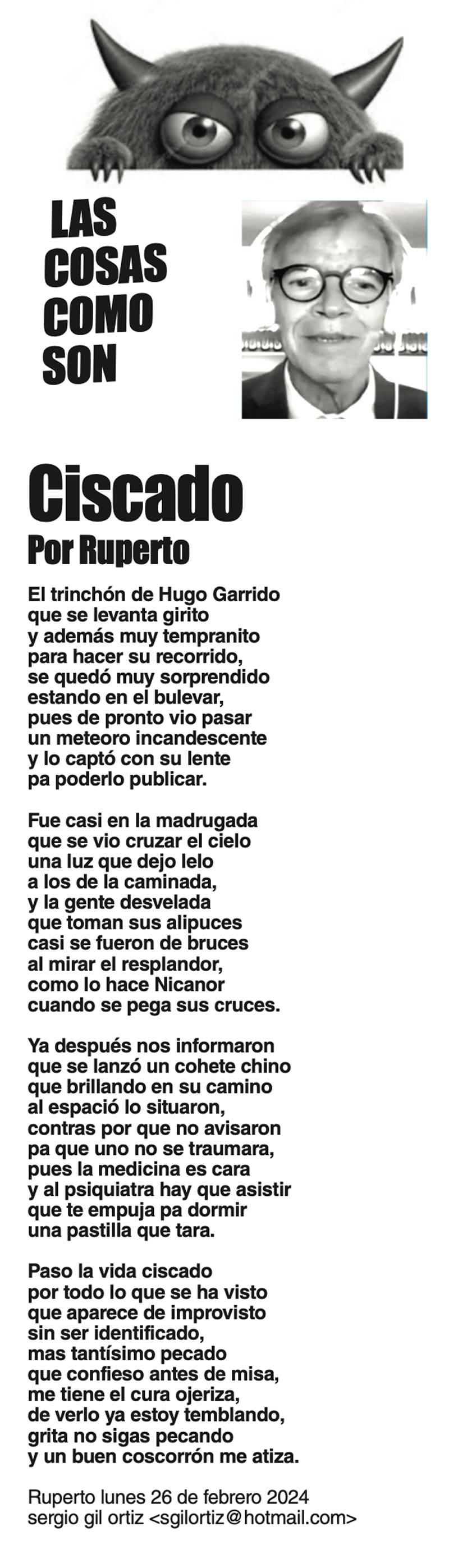 LAS COLUMNAS LAS COSAS COMO SON | - CISCADO CISCADO... 26 febrero 2024 Más Noticias CANCIONERO | PIRATAS DEL CARIBE - A la pregunta de qué va a hacer con el petróleo que llevaba el barco tanque grandote llamado Skipper y con bandera falsa de Guyana, que sus fuerzas armadas... ACERTIJOS | LOS 51 AÑOS DE NOTIVER - Allá por los años 70s nacía Notiver. Un día Guadalupano por un asunto de festejo familiar. Desde aquel día de hace 51 años, que este 12 de diciembre se cumplen, el diario... TEXTO IRREVERENTE | - Monumental, mágico, misterioso y meritorio. Así definen arqueólogos y antropólogos a El Tajín, la ciudad prehispánica que se ubica cerca de Papantla, al norte veracruzano... A MIL POR HORA | - **Los duendes existen **Honrar al IMSS **Comadrita traviesa **Javier Duarte seguirá preso... TEXTO IRREVERENTE | CINCUENTA + UNO - La familia notiveriana está velando vísperas pues mañana es su fiesta magna, la que tiene lugar cada fin de otoño, ya pisando el invierno. El cumpleaños de NOTIVER comparte fecha... CANCIONERO | EL GOZO AL POZO...DE AGUA - Muy pronto se apagó el argüende mediático armado desde Palacio Nacional, en torno a la señora presidente con A de patria, celebrando con sonrisa pareja del primer ministro de Canadá, el bailoteo al ritmo de YMCA... SIN TACTO | 4T, LAS CUENTAS ALEGRES - Bueno, cuando menos podemos aceptar que los morenos en el poder tienen una capacidad: seguir al pie de la letra las instrucciones del librito que indica cómo responder y qué decir… ACERTIJOS | POR LOS 51 DE NOTIVER - Un día antes auguraban un gran Norte, que entró en lunes. Al iniciar semana. Cotidianamente llegó con mi hermano Enrique, con Fernando Pavón, biógrafo de Tierra Blanca y el amigo... 51 Y CONTANDO… | - Medio siglo y un año, no se escribe ni fácil ni sin derramar una que otra lagrimilla: 51 años de éste su periódico NOTIVER. La Noticia en el momento que sucede, es un acontecimiento más... A MIL POR HORA | - **Migrante exitoso **Genio universal **Manipulador de mujeres **Ley vs vapeadores...