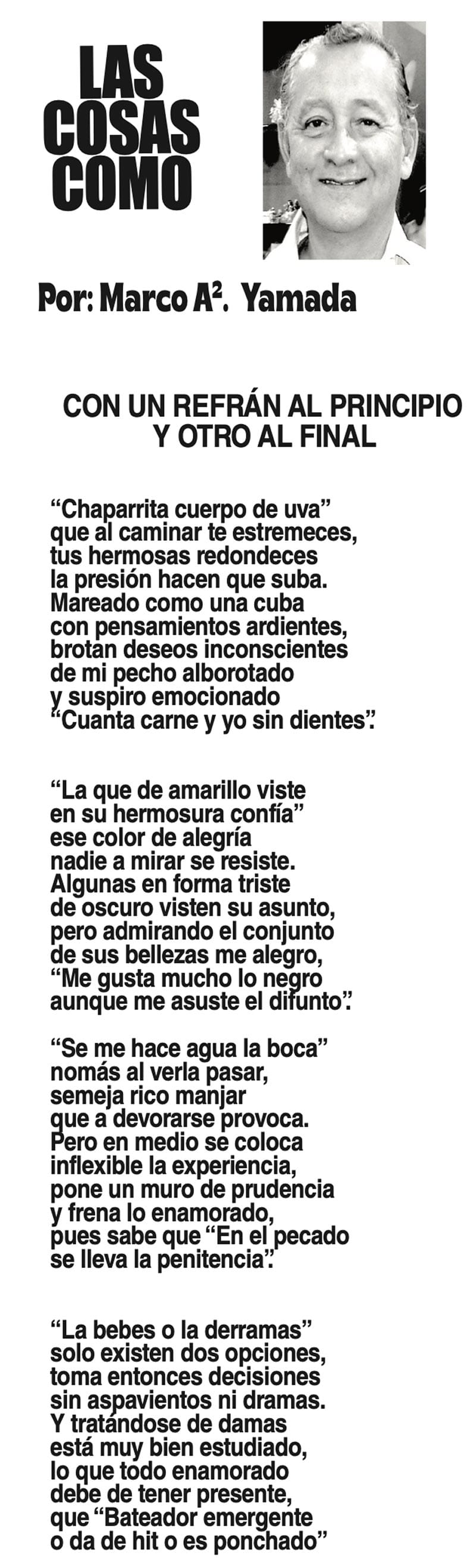 LAS COLUMNAS LAS COSAS COMO SON | - CON UN REFRÁN AL PRINCIPIO Y OTRO AL FINAL CON UN REFRÁN AL PRINCIPIO Y OTRO AL FINAL... 20 agosto 2024 Más Noticias LAS COSAS COMO SON | - MAS QUE UN DIARIO... TEXTO IRREVERENTE | LE VA A 'ECHAR GANITAS' - Al parecer, el asunto es 'chimoltrufiar' o sea lo mismo decir una cosa que otra. En marzo, el gobierno estatal informó que el programa de rehabilitación de carreteras y caminos conocido como "Bachetón"... ACERTIJOS | EL QUINTO PARTIDO - En la historia de los mundiales, México nunca ha jugado el quinto partido fuera de casa. Lo más que hemos alcanzado es el cuarto juego y de allí nos mandan a casa… A MIL POR HORA | - **Un matrimonio feliz **Apocalipsis jarocho **La isla de los pedófilos **“Amor con amor se paga”... A MIL POR HORA | - **Chicas más guapas **Días revolcados **Fascinantes artistas **Academia de Ególatras... CANCIONERO | EL PAN Y EL LLORO - Nada es accidental en la política. Este fin de semana, la señora presidente con A de patria tendrá una magna concentración de sus seguidores para celebrar el aniversario... TEXTO IRREVERENTE | ENNOCHEBUENADOS - La mercadotecnia adelanta todo y, ni modo, hay que lidiar con eso. Cuando todavía no acababa noviembre ya se vendían productos navideños y ahora mismo por doquiera se ven locales adornados con ese motivo... SIN TACTO | LAS VÍSPERAS - ¿Se acuerda la memorable lectora? ¿Recuerda el memorioso lector?: “Ya va llegando diciembre y sus posadas. Se va acercando ya también la Navidad. El año nuevo... LAS COSAS COMO SON - VAYA CINISMO... TEXTO IRREVERENTE | AÑO BUENO, AÑO MALO - El 2024 fue un año de suerte y abundancia. Este 2025 ha corrido en su contra con infortunio político y mediático. ¿‘Annus horribilis’? Tal vez no llega a tanto, pero sí desastroso y confirmatorio de sus...