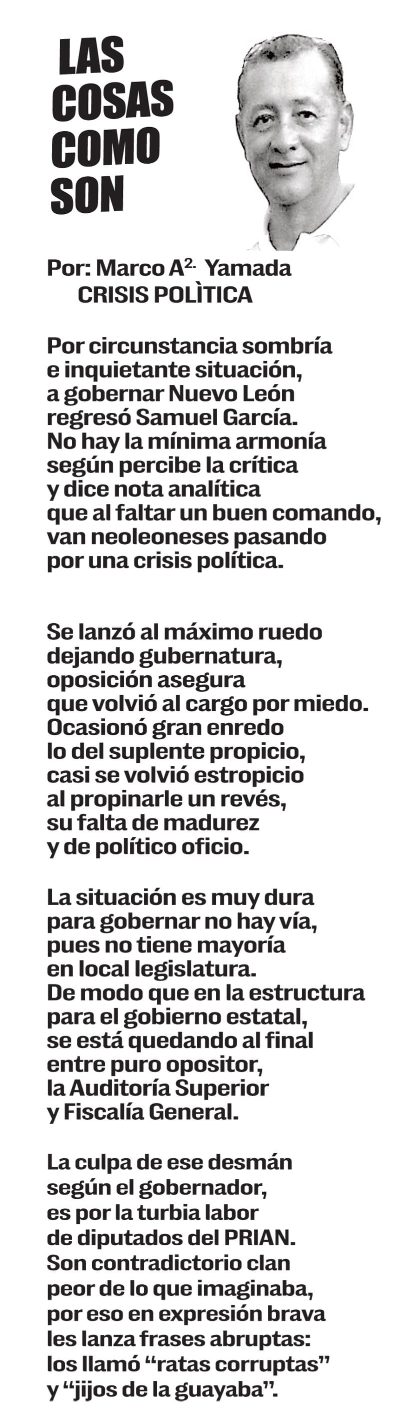 LAS COLUMNAS LAS COSAS COMO SON - CRISIS POLÍTICA CRISIS POLÍTICA... 14 diciembre 2023 Más Noticias LAS COSAS COMO SON | - MAS QUE UN DIARIO... TEXTO IRREVERENTE | LE VA A 'ECHAR GANITAS' - Al parecer, el asunto es 'chimoltrufiar' o sea lo mismo decir una cosa que otra. En marzo, el gobierno estatal informó que el programa de rehabilitación de carreteras y caminos conocido como "Bachetón"... ACERTIJOS | EL QUINTO PARTIDO - En la historia de los mundiales, México nunca ha jugado el quinto partido fuera de casa. Lo más que hemos alcanzado es el cuarto juego y de allí nos mandan a casa… A MIL POR HORA | - **Un matrimonio feliz **Apocalipsis jarocho **La isla de los pedófilos **“Amor con amor se paga”... A MIL POR HORA | - **Chicas más guapas **Días revolcados **Fascinantes artistas **Academia de Ególatras... CANCIONERO | EL PAN Y EL LLORO - Nada es accidental en la política. Este fin de semana, la señora presidente con A de patria tendrá una magna concentración de sus seguidores para celebrar el aniversario... TEXTO IRREVERENTE | ENNOCHEBUENADOS - La mercadotecnia adelanta todo y, ni modo, hay que lidiar con eso. Cuando todavía no acababa noviembre ya se vendían productos navideños y ahora mismo por doquiera se ven locales adornados con ese motivo... SIN TACTO | LAS VÍSPERAS - ¿Se acuerda la memorable lectora? ¿Recuerda el memorioso lector?: “Ya va llegando diciembre y sus posadas. Se va acercando ya también la Navidad. El año nuevo... LAS COSAS COMO SON - VAYA CINISMO... TEXTO IRREVERENTE | AÑO BUENO, AÑO MALO - El 2024 fue un año de suerte y abundancia. Este 2025 ha corrido en su contra con infortunio político y mediático. ¿‘Annus horribilis’? Tal vez no llega a tanto, pero sí desastroso y confirmatorio de sus...