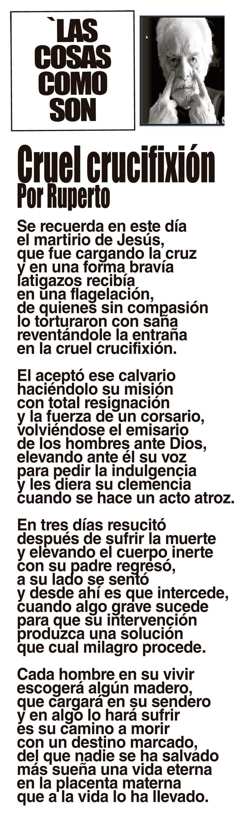 LAS COLUMNAS LAS COSAS COMO SON - CRUEL CRUCIFIXION... CRUEL CRUCIFIXION... 3 abril 2026 Más Noticias ACERTIJOS | AQUEL PARIS OCUPADO - Del Paris ocupado por la guerra, cuando lo nazis tomaron esa hermosa y única ciudad, el día que Hitler hizo su primer y único viaje fuera de Alemania, cuando visitó Paris con el gran arquitecto Albert Speer y se fueron... TEXTO IRREVERENTE | VIERNES DE URGENCIA - Desde los años setenta, cuando surgió la corriente liberadora en la Iglesia Católica, se gritaba por toda América Latina: ¡Necesitamos obispos al lado de los pobres! Era el clamor para que la jerarquía... A MIL POR HORA | - **Cristo en la historia **Revolución Robótica **Cinco reporteras **Actriz millonaria... ACERTIJOS | HABLANDO DEL MUNDIAL - Las televisoras cubren diariamente temas del Mundial. Ahora que se reinauguró el Estadio Azteca-Banorte, llego toda la flota del presidente de FIFA, el pelón Gianni Infantino, un hombre bueno y amigo... A MIL POR HORA | - **Ya no hay pecados **Nadie puede aburrirse **Papa platica con Dios **Chapopote y brujos... TEXTO IRREVERENTE | JUEVES DE LAVADO - Llegó el Jueves Santo de lavado y enjuagado. En la creencia cristina, el día es para recordar cuando Jesús dio una enseñanza de humildad pues siendo líder y maestro de sus seguidores se inclinó a... ACERTIJOS | LOVE STORY AQUELLA HISTORIA - Anoche en la tele terminé de ver la serie Love Story, una pequeña parte de la biografía de John F. Kennedy hijo, quien vivió un romance al lado de quien sería su esposa y terminaron encontrando... TEXTO IRREVERENTE | MARTES NEGRO - Pues el chapopote no se va, sigue arribando a las playas. Y ya es Martes Santo que bien puede ser un Martes Negro por el color de la contaminación. De norte a sur, el litoral jarocho está pringado de petróleo… A MIL POR HORA | - **Dios de un Beatle **La vida es bella **Leer, dicha superior **Risas digestivas… CANCIONERO | EL PASADO PESA - El mundillo de la política mexicana tiene el grave defecto nacido de su complejo de inferioridad, de que no hay novedad en el frente. Para sacudirse, necesita de vez en cuando que un medio…