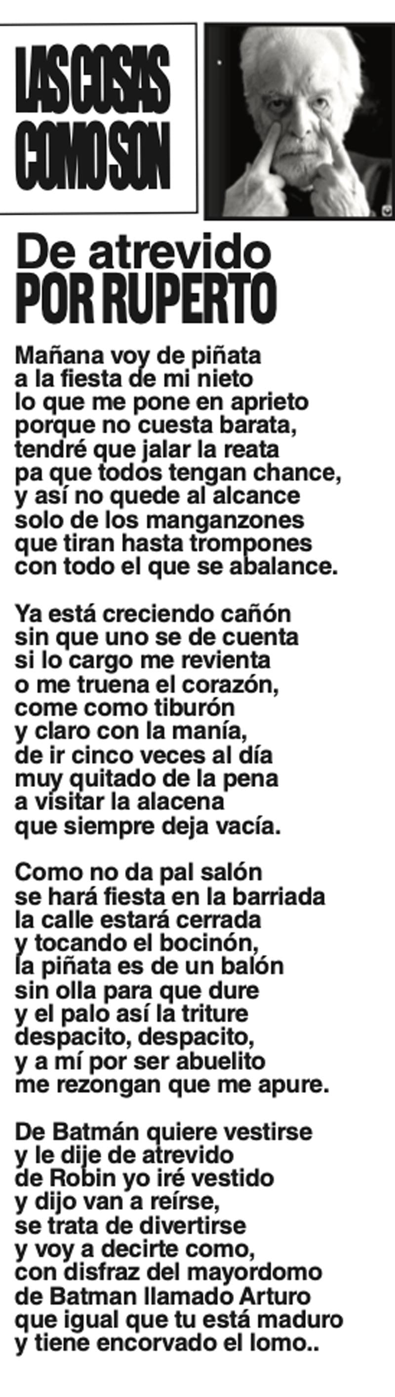 LAS COLUMNAS LAS COSAS COMO SON - DE ATREVIDO... DE ATREVIDO... 23 enero 2026 Más Noticias TEXTO IRREVERENTE | EL ESQUITERO - Es una historia de amor que mueve a la hilaridad porque los dos son igualitos, tan banales como insípidos -y no es ofensa sino descripción, nada más véanlos en las fotografías oficiales y en sus ‘posteos’... CANCIONERO | EL PRESO NÚMERO NUEVE - En mi Praga querida, aprendí que el prisionero va y viene diariamente nueve pasos en su celda; los mismos que su guardián afuera. Si no me equivoco, es una frase de Franz Kafka. Y si no lo es, lo merece. Francisco… SIN TACTO | LAS PLACAS - Seguramente el Gobierno de la ingeniera Rocío Nahle tiene sus razones para haber ordenado un cambio de placas en todos los vehículos que están registrados en Veracruz, y no me meteré aquí a desbrozar los motivos que tenga… ACERTIJOS | LOS PRECIOS DEL MANGO - Por prescripción médica, porque así dicen los doctores, hay que caminar diario, mínimo dos kilómetros. Eso hacía antes de caer a la operación, llegaba a cuatro y a veces me sentía superior a cualquiera y un mundo de… A MIL POR HORA | - **Historias vivificantes **Abrir paso en la vida **Empujar la carreta **Y sin bajar la guardia... SIN TACTO | GRACIAS A USTED - Hurgando en “Sin tacto” me di de frente con un texto que publiqué en 2014, precisamente el 20 de noviembre, y me produjo una sensación encontrada, porque me pude dar cuenta de que 15 años después hay un tema en el que sigo… CANCIONERO | TRUMP EN SUIZA - De toda su larga perorata en el foro mundial de Davos, lo único rescatable de la presentación de Donald Trump ahí, es su compromiso a que su obsesión por anexarse Groenlanda a su mapa personal - de la misma manera… ACERTIJOS | JOSE EMILIO PACHECO - Ante la insistencia de los reporteros, la periodista Cristina Pacheco aceptó salir del aula mayor de El Colegio Nacional, donde se colocó el féretro de su esposo, el poeta José Emilio Pacheco, para ir a… A MIL POR HORA | - **Hechos mágicos **Ebrio, gateaba **Toquetear chicos **55 retratos de Frida... A MIL POR HORA | - ** Rupturas amorosas ** IMSS: horas cardíacas ** Corrupción en la 4T ** Los peores días...