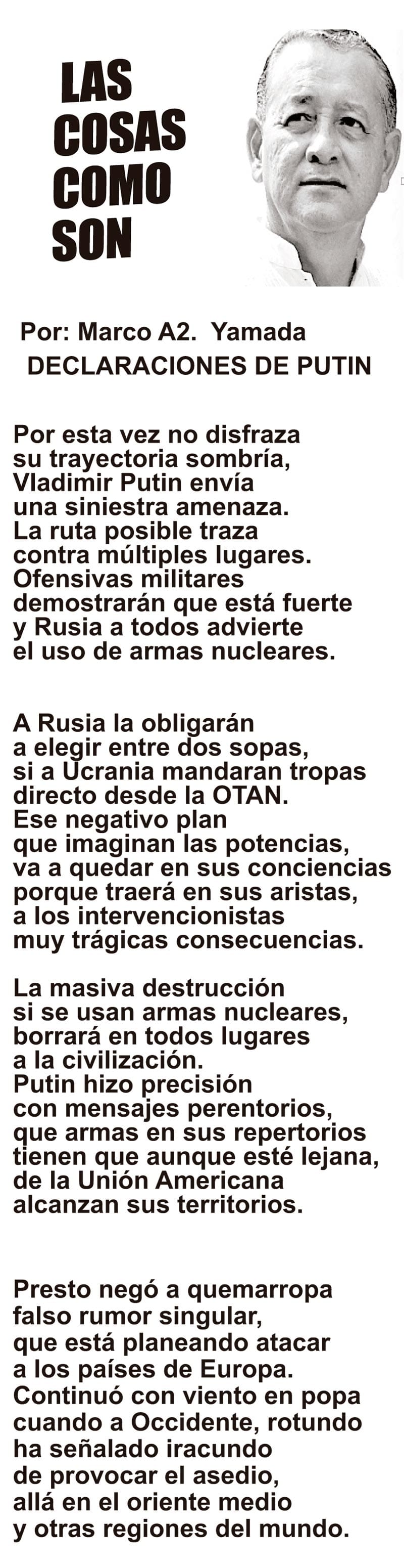 LAS COLUMNAS LAS COSAS COMO SON - | DECLARACIONES DE PUTIN DECLARACIONES DE PUTÍN... 2 marzo 2024 Más Noticias LAS COSAS COMO SON | - MAS QUE UN DIARIO... TEXTO IRREVERENTE | LE VA A 'ECHAR GANITAS' - Al parecer, el asunto es 'chimoltrufiar' o sea lo mismo decir una cosa que otra. En marzo, el gobierno estatal informó que el programa de rehabilitación de carreteras y caminos conocido como "Bachetón"... ACERTIJOS | EL QUINTO PARTIDO - En la historia de los mundiales, México nunca ha jugado el quinto partido fuera de casa. Lo más que hemos alcanzado es el cuarto juego y de allí nos mandan a casa… A MIL POR HORA | - **Un matrimonio feliz **Apocalipsis jarocho **La isla de los pedófilos **“Amor con amor se paga”... A MIL POR HORA | - **Chicas más guapas **Días revolcados **Fascinantes artistas **Academia de Ególatras... CANCIONERO | EL PAN Y EL LLORO - Nada es accidental en la política. Este fin de semana, la señora presidente con A de patria tendrá una magna concentración de sus seguidores para celebrar el aniversario... TEXTO IRREVERENTE | ENNOCHEBUENADOS - La mercadotecnia adelanta todo y, ni modo, hay que lidiar con eso. Cuando todavía no acababa noviembre ya se vendían productos navideños y ahora mismo por doquiera se ven locales adornados con ese motivo... SIN TACTO | LAS VÍSPERAS - ¿Se acuerda la memorable lectora? ¿Recuerda el memorioso lector?: “Ya va llegando diciembre y sus posadas. Se va acercando ya también la Navidad. El año nuevo... LAS COSAS COMO SON - VAYA CINISMO... TEXTO IRREVERENTE | AÑO BUENO, AÑO MALO - El 2024 fue un año de suerte y abundancia. Este 2025 ha corrido en su contra con infortunio político y mediático. ¿‘Annus horribilis’? Tal vez no llega a tanto, pero sí desastroso y confirmatorio de sus...