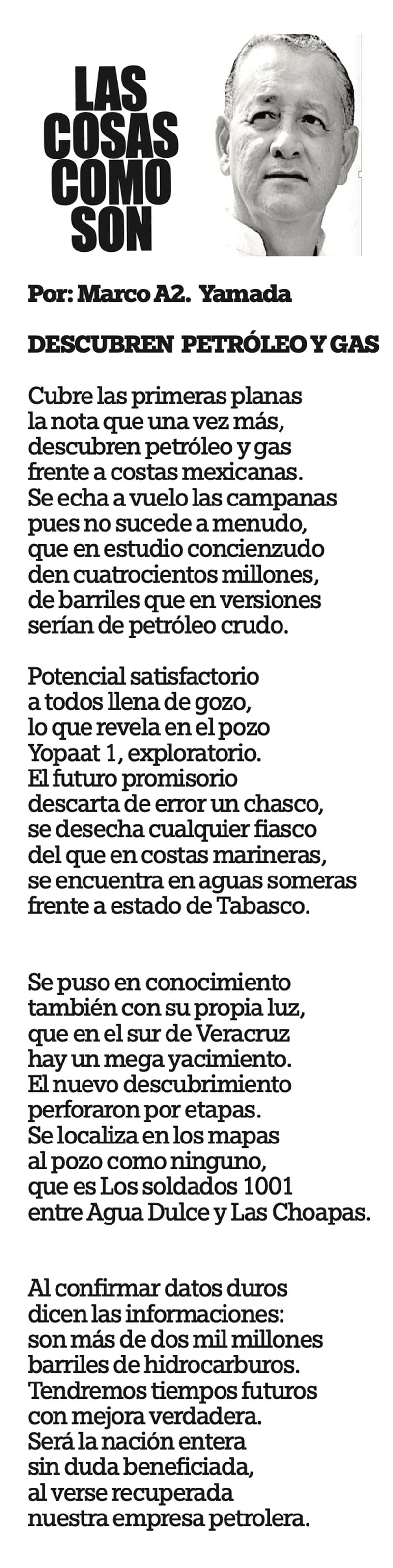 LAS COLUMNAS LAS COSAS COMO SON | - DESCUBREN PETRÓLEO Y GAS DESCUBREN PETRÓLEO Y GAS... 11 julio 2024 Más Noticias CANCIONERO | PIRATAS DEL CARIBE - A la pregunta de qué va a hacer con el petróleo que llevaba el barco tanque grandote llamado Skipper y con bandera falsa de Guyana, que sus fuerzas armadas... ACERTIJOS | LOS 51 AÑOS DE NOTIVER - Allá por los años 70s nacía Notiver. Un día Guadalupano por un asunto de festejo familiar. Desde aquel día de hace 51 años, que este 12 de diciembre se cumplen, el diario... TEXTO IRREVERENTE | - Monumental, mágico, misterioso y meritorio. Así definen arqueólogos y antropólogos a El Tajín, la ciudad prehispánica que se ubica cerca de Papantla, al norte veracruzano... A MIL POR HORA | - **Los duendes existen **Honrar al IMSS **Comadrita traviesa **Javier Duarte seguirá preso... TEXTO IRREVERENTE | CINCUENTA + UNO - La familia notiveriana está velando vísperas pues mañana es su fiesta magna, la que tiene lugar cada fin de otoño, ya pisando el invierno. El cumpleaños de NOTIVER comparte fecha... CANCIONERO | EL GOZO AL POZO...DE AGUA - Muy pronto se apagó el argüende mediático armado desde Palacio Nacional, en torno a la señora presidente con A de patria, celebrando con sonrisa pareja del primer ministro de Canadá, el bailoteo al ritmo de YMCA... SIN TACTO | 4T, LAS CUENTAS ALEGRES - Bueno, cuando menos podemos aceptar que los morenos en el poder tienen una capacidad: seguir al pie de la letra las instrucciones del librito que indica cómo responder y qué decir… ACERTIJOS | POR LOS 51 DE NOTIVER - Un día antes auguraban un gran Norte, que entró en lunes. Al iniciar semana. Cotidianamente llegó con mi hermano Enrique, con Fernando Pavón, biógrafo de Tierra Blanca y el amigo... 51 Y CONTANDO… | - Medio siglo y un año, no se escribe ni fácil ni sin derramar una que otra lagrimilla: 51 años de éste su periódico NOTIVER. La Noticia en el momento que sucede, es un acontecimiento más... A MIL POR HORA | - **Migrante exitoso **Genio universal **Manipulador de mujeres **Ley vs vapeadores...