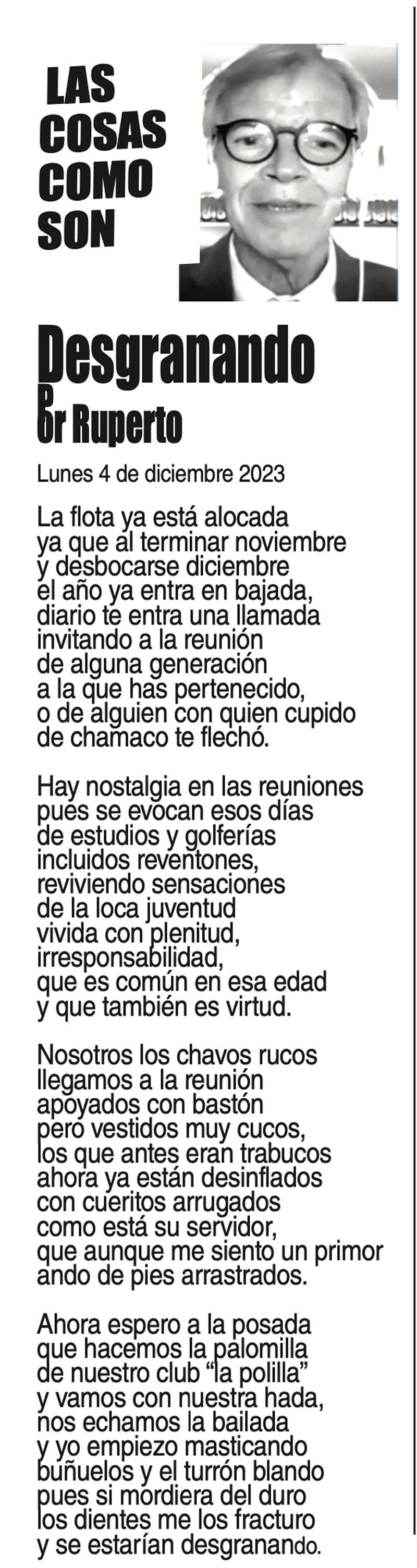 LAS COLUMNAS LAS COSAS COMO SON - DESGRANADO DESGRANADO... 4 diciembre 2023 Más Noticias LAS COSAS COMO SON | - MAS QUE UN DIARIO... TEXTO IRREVERENTE | LE VA A 'ECHAR GANITAS' - Al parecer, el asunto es 'chimoltrufiar' o sea lo mismo decir una cosa que otra. En marzo, el gobierno estatal informó que el programa de rehabilitación de carreteras y caminos conocido como "Bachetón"... ACERTIJOS | EL QUINTO PARTIDO - En la historia de los mundiales, México nunca ha jugado el quinto partido fuera de casa. Lo más que hemos alcanzado es el cuarto juego y de allí nos mandan a casa… A MIL POR HORA | - **Un matrimonio feliz **Apocalipsis jarocho **La isla de los pedófilos **“Amor con amor se paga”... A MIL POR HORA | - **Chicas más guapas **Días revolcados **Fascinantes artistas **Academia de Ególatras... CANCIONERO | EL PAN Y EL LLORO - Nada es accidental en la política. Este fin de semana, la señora presidente con A de patria tendrá una magna concentración de sus seguidores para celebrar el aniversario... TEXTO IRREVERENTE | ENNOCHEBUENADOS - La mercadotecnia adelanta todo y, ni modo, hay que lidiar con eso. Cuando todavía no acababa noviembre ya se vendían productos navideños y ahora mismo por doquiera se ven locales adornados con ese motivo... SIN TACTO | LAS VÍSPERAS - ¿Se acuerda la memorable lectora? ¿Recuerda el memorioso lector?: “Ya va llegando diciembre y sus posadas. Se va acercando ya también la Navidad. El año nuevo... LAS COSAS COMO SON - VAYA CINISMO... TEXTO IRREVERENTE | AÑO BUENO, AÑO MALO - El 2024 fue un año de suerte y abundancia. Este 2025 ha corrido en su contra con infortunio político y mediático. ¿‘Annus horribilis’? Tal vez no llega a tanto, pero sí desastroso y confirmatorio de sus...