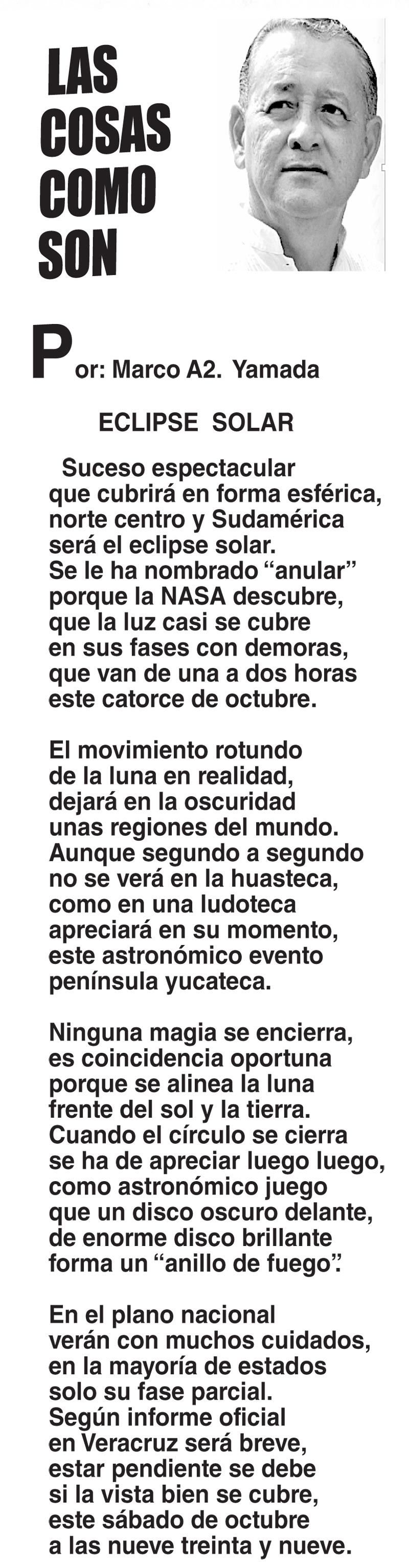 LAS COLUMNAS LAS COSAS COMO SON -ECLIPSE SOLAR ECLIPSE SOLAR... 14 octubre 2023 Más Noticias LAS COSAS COMO SON | - MAS QUE UN DIARIO... TEXTO IRREVERENTE | LE VA A 'ECHAR GANITAS' - Al parecer, el asunto es 'chimoltrufiar' o sea lo mismo decir una cosa que otra. En marzo, el gobierno estatal informó que el programa de rehabilitación de carreteras y caminos conocido como "Bachetón"... ACERTIJOS | EL QUINTO PARTIDO - En la historia de los mundiales, México nunca ha jugado el quinto partido fuera de casa. Lo más que hemos alcanzado es el cuarto juego y de allí nos mandan a casa… A MIL POR HORA | - **Un matrimonio feliz **Apocalipsis jarocho **La isla de los pedófilos **“Amor con amor se paga”... A MIL POR HORA | - **Chicas más guapas **Días revolcados **Fascinantes artistas **Academia de Ególatras... CANCIONERO | EL PAN Y EL LLORO - Nada es accidental en la política. Este fin de semana, la señora presidente con A de patria tendrá una magna concentración de sus seguidores para celebrar el aniversario... TEXTO IRREVERENTE | ENNOCHEBUENADOS - La mercadotecnia adelanta todo y, ni modo, hay que lidiar con eso. Cuando todavía no acababa noviembre ya se vendían productos navideños y ahora mismo por doquiera se ven locales adornados con ese motivo... SIN TACTO | LAS VÍSPERAS - ¿Se acuerda la memorable lectora? ¿Recuerda el memorioso lector?: “Ya va llegando diciembre y sus posadas. Se va acercando ya también la Navidad. El año nuevo... LAS COSAS COMO SON - VAYA CINISMO... TEXTO IRREVERENTE | AÑO BUENO, AÑO MALO - El 2024 fue un año de suerte y abundancia. Este 2025 ha corrido en su contra con infortunio político y mediático. ¿‘Annus horribilis’? Tal vez no llega a tanto, pero sí desastroso y confirmatorio de sus...