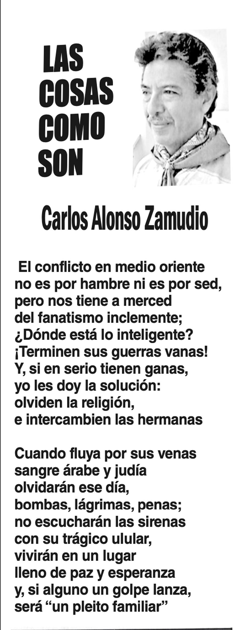 LAS COLUMNAS LAS COSAS COMO SON - El Conflicto en Medio Oriente... El conflicto en Medio Oriente... 11 octubre 2023 Más Noticias SIN TACTO | SOLO Y SÓLO /1 - Ha resultado muy polémica en el mundo de habla hispana la regla gramatical que impuso en 2010 la Real Academia Española de la Lengua cando desapareció el acento diacrítico para diferenciar el adjetivo “solo”… TEXTO IRREVERENTE | TURISMO DE BUFFET - Apresurados por revertir la mala publicidad de la marea negra contaminando el mar y el litoral jarochos, los propagandistas del gobierno estatal se pasaron el fin de semana difundiendo que las playas... ACERTIJOS | EL ABUELO SEBASTIAN EL CANO - Notiver lo tituló muy bien. Llegó a Veracruz el abuelo del Cuauhtémoc, el Buque Escuela español, Juan Sebastián Elcano, arribó al muelle del puerto de Veracruz y enseguida se convirtió en un sitio turístico... A MIL POR HORA | - **Cuentistas inmortales **Shorts electrizantes **Obsesión de la Bamba **Miami, paraíso de ricos... CANCIONERO | PIEL FINA - Nos tardamos un poco en entender que la señora presidente con A de Patria tiene la piel muy fina y sensible. Tan lo es, que no tolera ni siquiera la insinuación de que la perfección en sus esfuerzos no existe. Especialmente… LAS COSAS COMO SON - PEDI EL DESEO... ACERTIJOS | EL CINE REVITALIZADO - El cine día a día se revitaliza. Suelo presumir de ser cinero. Desde los tiempos remotos en que de chiquillo no salía de las tres salas cinematográficas que existían en mi pueblo: cine Margo, el Sección 25 de los... TEXTO IRREVERENTE | LOS TIJERETEADOS - Es un asunto que los desnuda por incumplir sus compromisos de serenar al país, ponerse al lado de las víctimas y hacerles justicia. Por eso les enoja mucho cuando se habla al respecto. Ya desde el sexenio pasado... A MIL POR HORA | - **La vida sigue… **Auge de taquerías **Peores desgracias **Crisis conyugal... SIN TACTO | AUSTERIDAD - Se muestra muy preocupada la presidenta Claudia Sheinbaum por los gastos superfluos e innecesarios que ocurren en el presupuesto público, y con tal situación, le dice al pueblo honesto y...