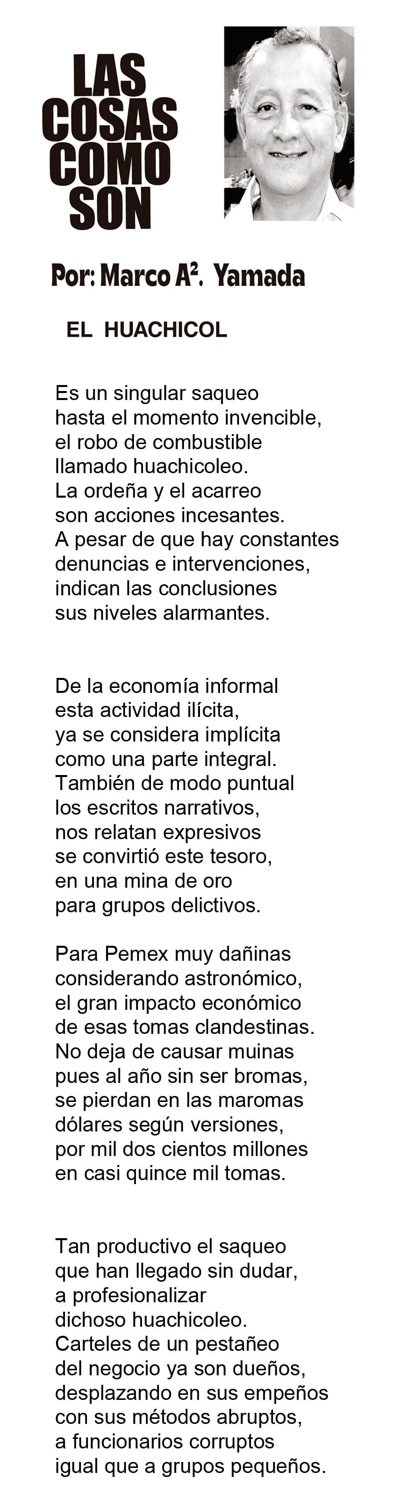 LAS COLUMNAS LAS COSAS COMO SON | - EL HUACHICOL EL HUACHICOL 19 septiembre 2024 Más Noticias LAS COSAS COMO SON | - MAS QUE UN DIARIO... TEXTO IRREVERENTE | LE VA A 'ECHAR GANITAS' - Al parecer, el asunto es 'chimoltrufiar' o sea lo mismo decir una cosa que otra. En marzo, el gobierno estatal informó que el programa de rehabilitación de carreteras y caminos conocido como "Bachetón"... ACERTIJOS | EL QUINTO PARTIDO - En la historia de los mundiales, México nunca ha jugado el quinto partido fuera de casa. Lo más que hemos alcanzado es el cuarto juego y de allí nos mandan a casa… A MIL POR HORA | - **Un matrimonio feliz **Apocalipsis jarocho **La isla de los pedófilos **“Amor con amor se paga”... A MIL POR HORA | - **Chicas más guapas **Días revolcados **Fascinantes artistas **Academia de Ególatras... CANCIONERO | EL PAN Y EL LLORO - Nada es accidental en la política. Este fin de semana, la señora presidente con A de patria tendrá una magna concentración de sus seguidores para celebrar el aniversario... TEXTO IRREVERENTE | ENNOCHEBUENADOS - La mercadotecnia adelanta todo y, ni modo, hay que lidiar con eso. Cuando todavía no acababa noviembre ya se vendían productos navideños y ahora mismo por doquiera se ven locales adornados con ese motivo... SIN TACTO | LAS VÍSPERAS - ¿Se acuerda la memorable lectora? ¿Recuerda el memorioso lector?: “Ya va llegando diciembre y sus posadas. Se va acercando ya también la Navidad. El año nuevo... LAS COSAS COMO SON - VAYA CINISMO... TEXTO IRREVERENTE | AÑO BUENO, AÑO MALO - El 2024 fue un año de suerte y abundancia. Este 2025 ha corrido en su contra con infortunio político y mediático. ¿‘Annus horribilis’? Tal vez no llega a tanto, pero sí desastroso y confirmatorio de sus...
