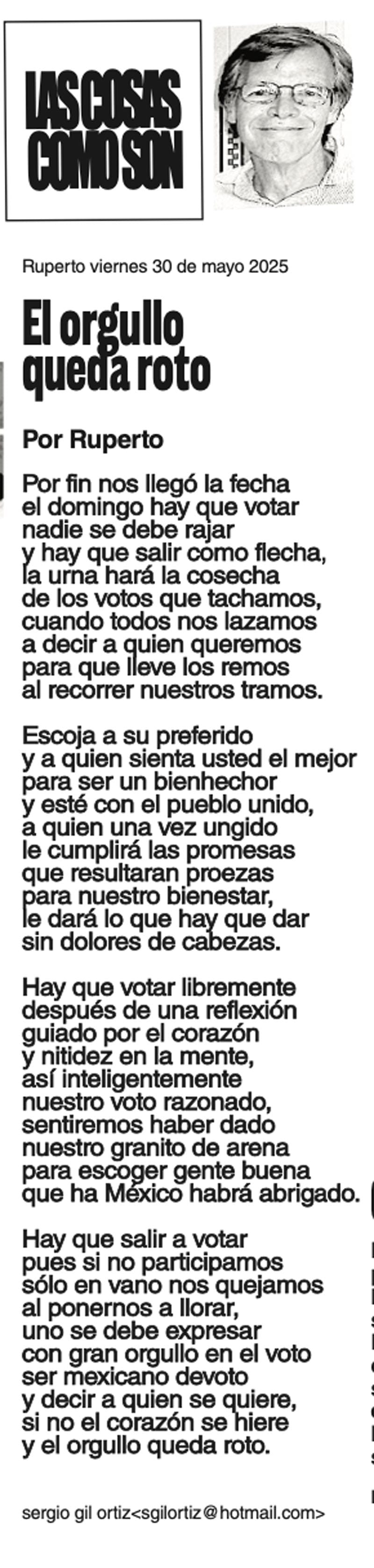 LAS COLUMNAS LAS COSAS COMO SON | - EL ORGULLO QUEDA ROTO EL ORGULLO QUEDA ROTO... 30 mayo 2025 Más Noticias CANCIONERO | PIRATAS DEL CARIBE - A la pregunta de qué va a hacer con el petróleo que llevaba el barco tanque grandote llamado Skipper y con bandera falsa de Guyana, que sus fuerzas armadas... ACERTIJOS | LOS 51 AÑOS DE NOTIVER - Allá por los años 70s nacía Notiver. Un día Guadalupano por un asunto de festejo familiar. Desde aquel día de hace 51 años, que este 12 de diciembre se cumplen, el diario... TEXTO IRREVERENTE | - Monumental, mágico, misterioso y meritorio. Así definen arqueólogos y antropólogos a El Tajín, la ciudad prehispánica que se ubica cerca de Papantla, al norte veracruzano... A MIL POR HORA | - **Los duendes existen **Honrar al IMSS **Comadrita traviesa **Javier Duarte seguirá preso... TEXTO IRREVERENTE | CINCUENTA + UNO - La familia notiveriana está velando vísperas pues mañana es su fiesta magna, la que tiene lugar cada fin de otoño, ya pisando el invierno. El cumpleaños de NOTIVER comparte fecha... CANCIONERO | EL GOZO AL POZO...DE AGUA - Muy pronto se apagó el argüende mediático armado desde Palacio Nacional, en torno a la señora presidente con A de patria, celebrando con sonrisa pareja del primer ministro de Canadá, el bailoteo al ritmo de YMCA... SIN TACTO | 4T, LAS CUENTAS ALEGRES - Bueno, cuando menos podemos aceptar que los morenos en el poder tienen una capacidad: seguir al pie de la letra las instrucciones del librito que indica cómo responder y qué decir… ACERTIJOS | POR LOS 51 DE NOTIVER - Un día antes auguraban un gran Norte, que entró en lunes. Al iniciar semana. Cotidianamente llegó con mi hermano Enrique, con Fernando Pavón, biógrafo de Tierra Blanca y el amigo... 51 Y CONTANDO… | - Medio siglo y un año, no se escribe ni fácil ni sin derramar una que otra lagrimilla: 51 años de éste su periódico NOTIVER. La Noticia en el momento que sucede, es un acontecimiento más... A MIL POR HORA | - **Migrante exitoso **Genio universal **Manipulador de mujeres **Ley vs vapeadores...