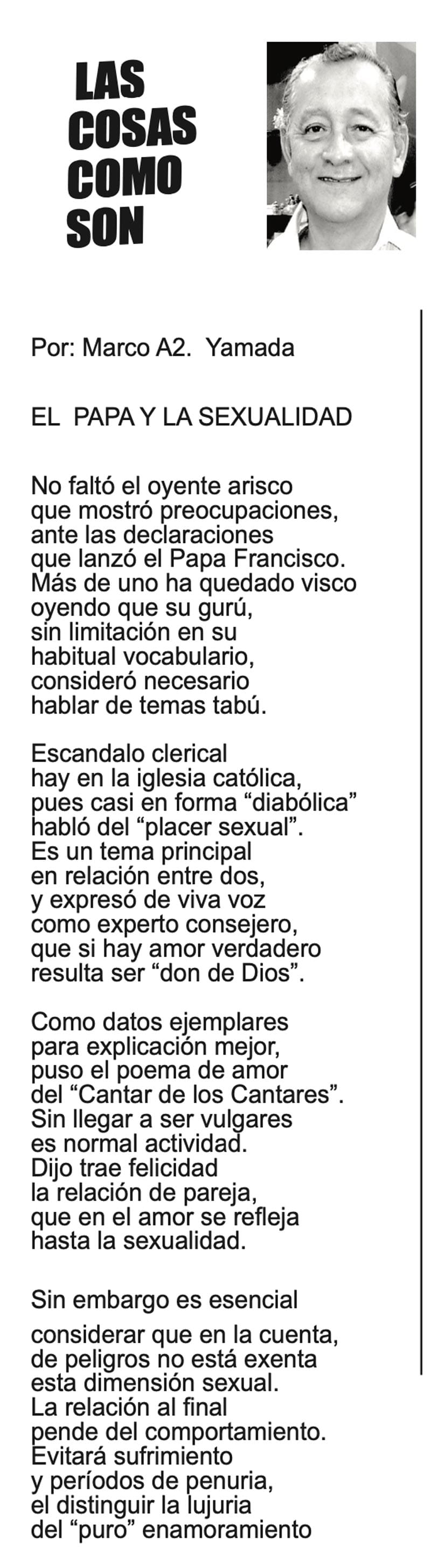 LAS COLUMNAS LAS COSAS COMO SON - EL PAPA Y LA SEXUALIDAD! EL PAPA Y LA SEXUALIDAD! 23 enero 2024 Más Noticias LAS COSAS COMO SON | - MAS QUE UN DIARIO... TEXTO IRREVERENTE | LE VA A 'ECHAR GANITAS' - Al parecer, el asunto es 'chimoltrufiar' o sea lo mismo decir una cosa que otra. En marzo, el gobierno estatal informó que el programa de rehabilitación de carreteras y caminos conocido como "Bachetón"... ACERTIJOS | EL QUINTO PARTIDO - En la historia de los mundiales, México nunca ha jugado el quinto partido fuera de casa. Lo más que hemos alcanzado es el cuarto juego y de allí nos mandan a casa… A MIL POR HORA | - **Un matrimonio feliz **Apocalipsis jarocho **La isla de los pedófilos **“Amor con amor se paga”... A MIL POR HORA | - **Chicas más guapas **Días revolcados **Fascinantes artistas **Academia de Ególatras... CANCIONERO | EL PAN Y EL LLORO - Nada es accidental en la política. Este fin de semana, la señora presidente con A de patria tendrá una magna concentración de sus seguidores para celebrar el aniversario... TEXTO IRREVERENTE | ENNOCHEBUENADOS - La mercadotecnia adelanta todo y, ni modo, hay que lidiar con eso. Cuando todavía no acababa noviembre ya se vendían productos navideños y ahora mismo por doquiera se ven locales adornados con ese motivo... SIN TACTO | LAS VÍSPERAS - ¿Se acuerda la memorable lectora? ¿Recuerda el memorioso lector?: “Ya va llegando diciembre y sus posadas. Se va acercando ya también la Navidad. El año nuevo... LAS COSAS COMO SON - VAYA CINISMO... TEXTO IRREVERENTE | AÑO BUENO, AÑO MALO - El 2024 fue un año de suerte y abundancia. Este 2025 ha corrido en su contra con infortunio político y mediático. ¿‘Annus horribilis’? Tal vez no llega a tanto, pero sí desastroso y confirmatorio de sus...