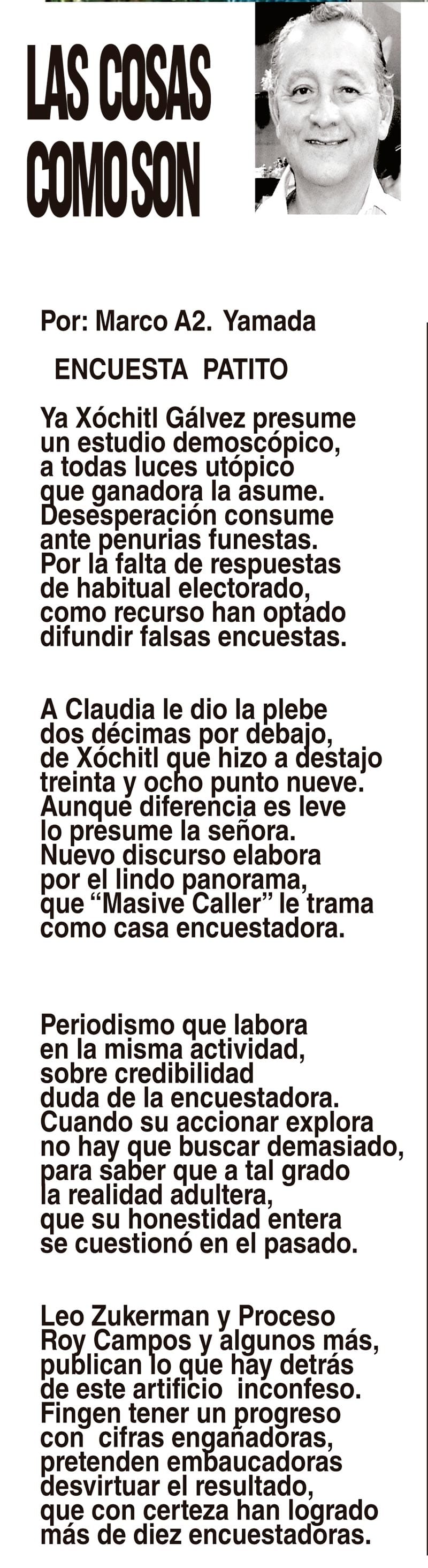 LAS COLUMNAS LAS COSAS COMO SON | - ENCUESTA PATITO ENCUESTA PATITO... 4 mayo 2024 Más Noticias CANCIONERO | 1938, OTRA VEZ - Me sorprende la ligereza con la que algunos analistas mexicanos han juzgado el discurso del miércoles por la noche del presidente Donald Trump, y la implícita amenaza de acciones militares... TEXTO IRREVERENTE | A LA PUERTA - Un escándalo de corrupción le estalló en su puerta al hidalguense Ricardo Ahued: el "cartel inmobiliario" en el que están involucrados jueces, notarios, empresarios y funcionarios... A MIL POR HORA | - **Tener miedo **Vivir con miedo **Cambios en Xalapa **Feliz con Alexa... LAS COSAS COMO SON | - ME PUSE A CHIFLAR... ACERTIJOS | NO TENGÁIS MIEDO - Todos los católicos y no católicos, recordamos las primeras palabras de Juan Pablo Segundo, cuando fue entronizado Papa y salió al balcón del Vaticano, donde ellos suelen... MIRADOR | - Los espectros que vagan en la noche por los aposentos de la casona del Potrero piensan que yo también soy un espectro, y me tratan con familiaridad. Doña Lucita de la Peña y Dávila... A MIL POR HORA | - **Una mujer tóxica **Marino asesinado **Julissa deslumbrante **Político incómodo... CANCIONERO | LAS AGUAS MEDIAS - Lo que menos me gusta de la modernidad es que cada vez me entero de más cosas ingratas. Viendo las noticias en las estaciones de televisión los Estados Unidos, especialmente… TEXTO IRREVERENTE | FINAL KÁRMICO - Hace cuatro años, los alcaldes electos de Fortín de las Flores, Córdoba y Medellín de Bravo, morenistas todos, hicieron campaña e iniciaron sus gobiernos con críticas, descalificaciones... SIN TACTO | BIBI EN PUENTE NACIONAL - Por primera vez, Movimiento Ciudadano va a gobernar el municipio de Puente Nacional, aunque será la tercera ocasión en que una mujer lidera la comuna: Bibiana Báez…