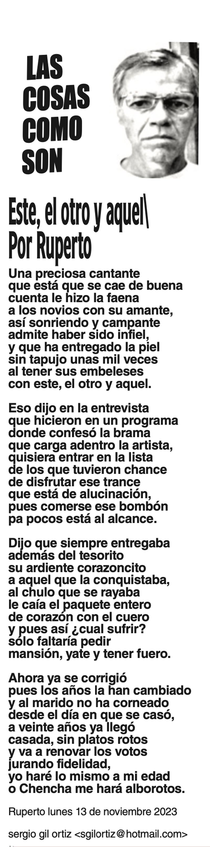 LAS COLUMNAS LAS COSAS COMO SON - ESTE, EL OTRO Y AQUEL ESTE, EL OTRO Y AQUEL... 13 noviembre 2023 Más Noticias SIN TACTO | SOLO Y SÓLO /1 - Ha resultado muy polémica en el mundo de habla hispana la regla gramatical que impuso en 2010 la Real Academia Española de la Lengua cando desapareció el acento diacrítico para diferenciar el adjetivo “solo”… TEXTO IRREVERENTE | TURISMO DE BUFFET - Apresurados por revertir la mala publicidad de la marea negra contaminando el mar y el litoral jarochos, los propagandistas del gobierno estatal se pasaron el fin de semana difundiendo que las playas... ACERTIJOS | EL ABUELO SEBASTIAN EL CANO - Notiver lo tituló muy bien. Llegó a Veracruz el abuelo del Cuauhtémoc, el Buque Escuela español, Juan Sebastián Elcano, arribó al muelle del puerto de Veracruz y enseguida se convirtió en un sitio turístico... A MIL POR HORA | - **Cuentistas inmortales **Shorts electrizantes **Obsesión de la Bamba **Miami, paraíso de ricos... CANCIONERO | PIEL FINA - Nos tardamos un poco en entender que la señora presidente con A de Patria tiene la piel muy fina y sensible. Tan lo es, que no tolera ni siquiera la insinuación de que la perfección en sus esfuerzos no existe. Especialmente… LAS COSAS COMO SON - PEDI EL DESEO... ACERTIJOS | EL CINE REVITALIZADO - El cine día a día se revitaliza. Suelo presumir de ser cinero. Desde los tiempos remotos en que de chiquillo no salía de las tres salas cinematográficas que existían en mi pueblo: cine Margo, el Sección 25 de los... TEXTO IRREVERENTE | LOS TIJERETEADOS - Es un asunto que los desnuda por incumplir sus compromisos de serenar al país, ponerse al lado de las víctimas y hacerles justicia. Por eso les enoja mucho cuando se habla al respecto. Ya desde el sexenio pasado... A MIL POR HORA | - **La vida sigue… **Auge de taquerías **Peores desgracias **Crisis conyugal... SIN TACTO | AUSTERIDAD - Se muestra muy preocupada la presidenta Claudia Sheinbaum por los gastos superfluos e innecesarios que ocurren en el presupuesto público, y con tal situación, le dice al pueblo honesto y...
