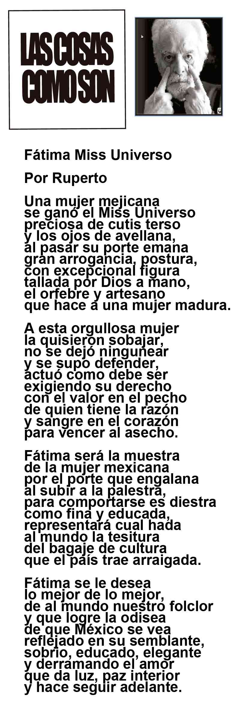 LAS COLUMNAS LAS COSAS COMO SON - FATIMA MISS UNIVERSO... FATIMA MISS UNIVERSO... 24 noviembre 2025 Más Noticias A MIL POR HORA | - **Chicas más guapas **Días revolcados **Fascinantes artistas **Academia de Ególatras... CANCIONERO | EL PAN Y EL LLORO - Nada es accidental en la política. Este fin de semana, la señora presidente con A de patria tendrá una magna concentración de sus seguidores para celebrar el aniversario... TEXTO IRREVERENTE | ENNOCHEBUENADOS - La mercadotecnia adelanta todo y, ni modo, hay que lidiar con eso. Cuando todavía no acababa noviembre ya se vendían productos navideños y ahora mismo por doquiera se ven locales adornados con ese motivo... SIN TACTO | LAS VÍSPERAS - ¿Se acuerda la memorable lectora? ¿Recuerda el memorioso lector?: “Ya va llegando diciembre y sus posadas. Se va acercando ya también la Navidad. El año nuevo... LAS COSAS COMO SON - VAYA CINISMO... TEXTO IRREVERENTE | AÑO BUENO, AÑO MALO - El 2024 fue un año de suerte y abundancia. Este 2025 ha corrido en su contra con infortunio político y mediático. ¿‘Annus horribilis’? Tal vez no llega a tanto, pero sí desastroso y confirmatorio de sus... SIN TACTO | ¿PORRAS A NOROÑA? - El cada vez más impresentable y alocado Gerardo Fernández Noroña le hizo el dudoso honor y el muy flaco favor a la gobernadora Rocío Nahle… ACERTIJOS | - Decía un gran columnista, que aunque fuera día de celebración o de cumple o de lo que sea, nunca hay que dejar de teclear algo, para seguir activos. Hoy es mi cumple... CANCIONERO | EL FISCAL INCÓMODO - Nadie pudo imaginar que un incidente en el concurso de Miss Universo, esa feria machista de la carne y la lascivia, disfrazada del más pueril nacionalismo, fuera a… A MIL POR HORA | - **Un día feliz **Amores prohibidos **$350 mil de recompensas **La política más joven...