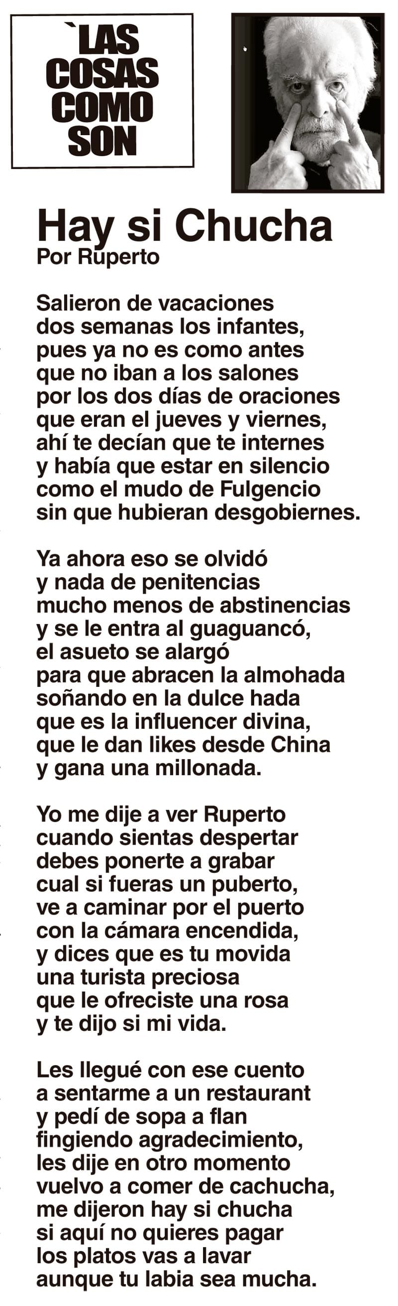 LAS COLUMNAS LAS COSAS COMO SON - HAY SI CHUCHA... HAY SI CHUCHA... 30 marzo 2026 Más Noticias SIN TACTO | EL MENSAJE DE DON JORGE CARLOS - Ha empezado la Semana Santa de 2026. Entre las fiestas y el ocio de la vacación, no faltan los creyentes que aprovechan esta época de recogimiento y devoción para reflexionar... A MIL POR HORA | - **Reencarnar en un animal **Galán mítico **Veracruz ensangrentado **Políticos encumbrados... ACERTIJOS | LOS DOS LIBROS - El año pasado, estando en el aeropuerto de Santander, cuyo nombre es en homenaje al gran golfista español, Severiano (Seve) Ballesteros, (Entre sus títulos más destacados, cinco Campeonatos del Mundo... CANCIONERO | LOS ASESINOS NIÑOS - El imbécil código de procedimientos penales nos obliga a decir solamente que se llama Osmer H, y que tiene quince años. A cambio, de las dos mujeres asesinadas a balazos por este huerco, la semana pasada... TEXTO IRREVERENTE | LUNES DE NEGACIÓN - La Semana Santa comenzó enchapopotada en Veracruz. Y no es porque hayan asfaltado las carreteras para facilitar el flujo de turistas sino porque el chapopote está donde no debería... TURISMÓLOGO | SEDE MUNDIAL HISTÓRICA.... - Siendo importante el Turismo Deportivo pues moviliza a millones de personas, por diferentes partes del mundo sin importar el tipo de clima y distancias, por lo que está considerado... A MIL POR HORA | - **Tragedia migrante **Las tías filosas **Modelos esqueléticas **Nahle, chapopoteada... ACERTIJOS | EL GRAN EDUARDO GALEANO - Nunca le conocí y debí haber ido a una de esas grandes conferencias que exhibía, cuando venía invitado por la Universidad Veracruzana (UV) a Xalapa, en Veracruz. Pero he leído los más libros que he podido... DIARIO DE UN REPORTERO | CIENTO VEINTIOCHO TONELADAS DE GOTAS - Sí. Tenemos un problema. Rocío Nahle, la gobernadora de Veracruz, asegura que las playas del estado están limpias: "El petróleo llegó en forma de gotas, fueron residuos". Y rehuye hablar… A MIL POR HORA | - **Accidentes caseros **Imposible olvidar… **Robots profesores **Nahle, sobrada de poder...