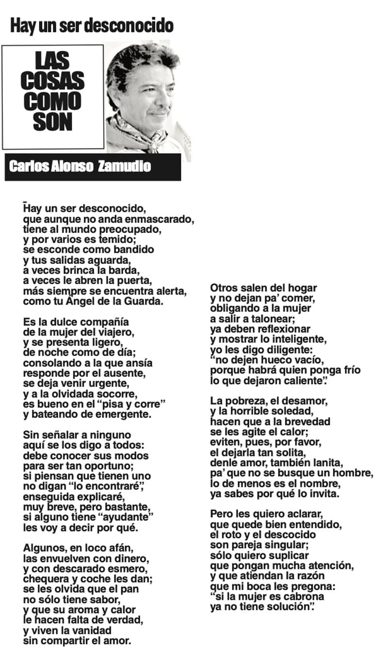 LAS COLUMNAS LAS COSAS COMO SON - HAY UN SER DESCONOCIDO... HAY UN SER DESCONOCIDO... 18 marzo 2026 Más Noticias A MIL POR HORA | - **Horas turbulentas **Éxito de la minifalda **Suculentos platillos **Migrantes de Steinbeck... SIN TACTO | ESTÉTICA URBANA - Ahora que los vientos del norte apabullaron techos, instalaciones eléctricas y espectaculares, viene a modo revisar la situación de los postes de cableado aéreo, porque Eolo, el señor de los vientos, anduvo… CANCIONERO | NOBLEZA OBLIGA - Cuando son tiempos de estulticia, cosa que sucede con mucha frecuencia en la política, cualquier indicio de cordura y buen juicio es plausible. Durante el sexenio del papá de Andy tuvimos mucho de lo primero y… ACERTIJOS | AQUEL LIO MÉXICO - ESPAÑA - Todos recordamos aquel lio que inició doña Beatriz Gutiérrez Müller, esposa de AMLO, cuando quería que los reyes de España pidieran de rodillas perdón a México por la Conquista y las brutalidades que seguro… TEXTO IRREVERENTE | YA NO LO QUIEREN - En el Partido del Trabajo (PT) de Veracruz acariciaron el sueño de liberarlo de los caciquillos de cebo y hojalata que se creen sus dueños. Hace dos fines de semanas, el sábado 7 de marzo, dicho instituto realizó... ACERTIJOS | UNA LIMOSNA PARA ESE POBRE VIEJO - Sorprendió a propios y extraños que, Ya Saben Quién, reapareciera de su exilio dorado, rodeado de fortalezas y soldados y la Guardia Nacional, por lo que pudiera ofrecerse... TEXTO IRREVERENTE | UN PADROTE MENOR - Apenas es uno y ya en el congreso local cantan que el asunto está cerrado. La semana pasada se informó sobre la detención de un empleado por presunto acoso sexual en contra de compañeras, un tal... CANCIONERO | TOTAL - Yo, ingenuo, llegué a pensar que las rémoras del cuatrote, los llamados partidos Verde Ecologista y del Trabajo, harían valer con mayor enjundia su privilegiada posición actual de fiel en la balanza de los votos… SIN TACTO | Alcaldes chapulines: el pecado y la penitencia - Bueno, tienen que justificar su defección como sea, así que se inventaron cargos de conciencia inexistentes y se desgarraron las vestiduras ideológicas para gritar que después de competir... A MIL POR HORA | - **RECHAZÓ OSCAR 4 VECES **PANCHO VILLA, INFIEL #1 **CERTAMEN DE GARNACHAS **MUJERES MORMONAS...