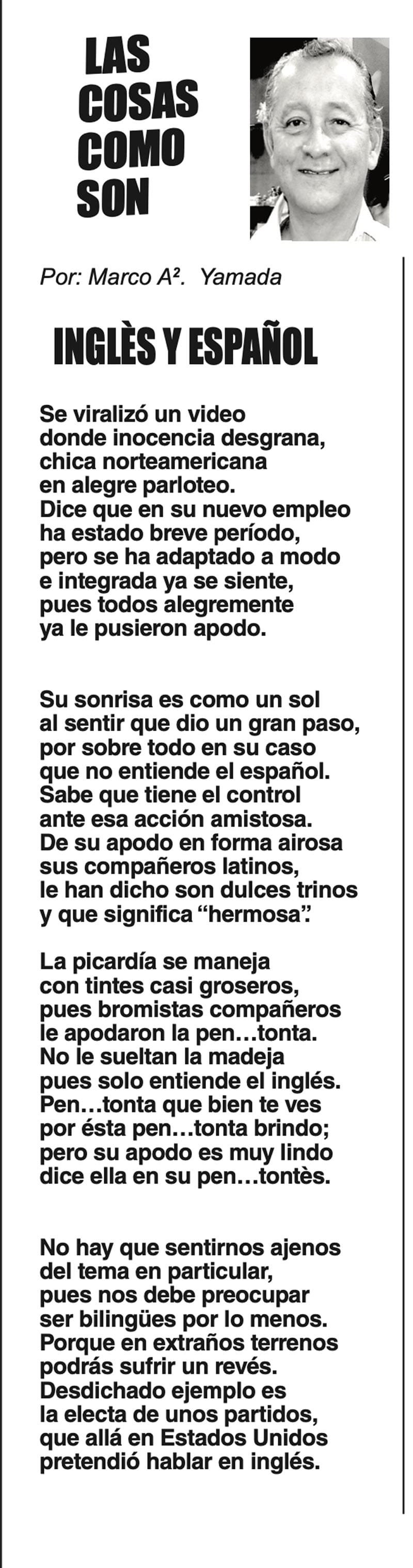 LAS COLUMNAS LAS COSAS COMO SON - INGLÉS Y ESPAÑOL INGLÉS Y ESPAÑOL... 8 febrero 2024 Más Noticias TEXTO IRREVERENTE | UN ARTE ETERNO - Envejecer haciendo periodismo no es sinónimo de obsolescencia ni de ser retardatario. La llamada ‘vieja guardia’ de la reporteada y del análisis periodístico... DIARIO DE UN REPORTERO | Y TODO ¿PARA QUÉ? - Tres días estuvo cerrado el centro de Xalapa porque se preparaba el escenario para el primer informe de la gobernadora Rocío Nahle. El tránsito... ACERTIJOS | NACEN LOS RIVALES EN FIFA - Es la mañana del sorteo de FIFA, en Washington, que amanece con un frio del carajo a 2 grados bajo cero y con caída de nieve. Llegan al Kennedy Center… A MIL POR HORA | - **5 películas icónicas **Seniles: bailar en casa **Marilyn y Chanel 5 **Sabroso quesito fundido... LAS COSAS COMO SON | - MAS QUE UN DIARIO... TEXTO IRREVERENTE | LE VA A 'ECHAR GANITAS' - Al parecer, el asunto es 'chimoltrufiar' o sea lo mismo decir una cosa que otra. En marzo, el gobierno estatal informó que el programa de rehabilitación de carreteras y caminos conocido como "Bachetón"... ACERTIJOS | EL QUINTO PARTIDO - En la historia de los mundiales, México nunca ha jugado el quinto partido fuera de casa. Lo más que hemos alcanzado es el cuarto juego y de allí nos mandan a casa… A MIL POR HORA | - **Un matrimonio feliz **Apocalipsis jarocho **La isla de los pedófilos **“Amor con amor se paga”... A MIL POR HORA | - **Chicas más guapas **Días revolcados **Fascinantes artistas **Academia de Ególatras... CANCIONERO | EL PAN Y EL LLORO - Nada es accidental en la política. Este fin de semana, la señora presidente con A de patria tendrá una magna concentración de sus seguidores para celebrar el aniversario...