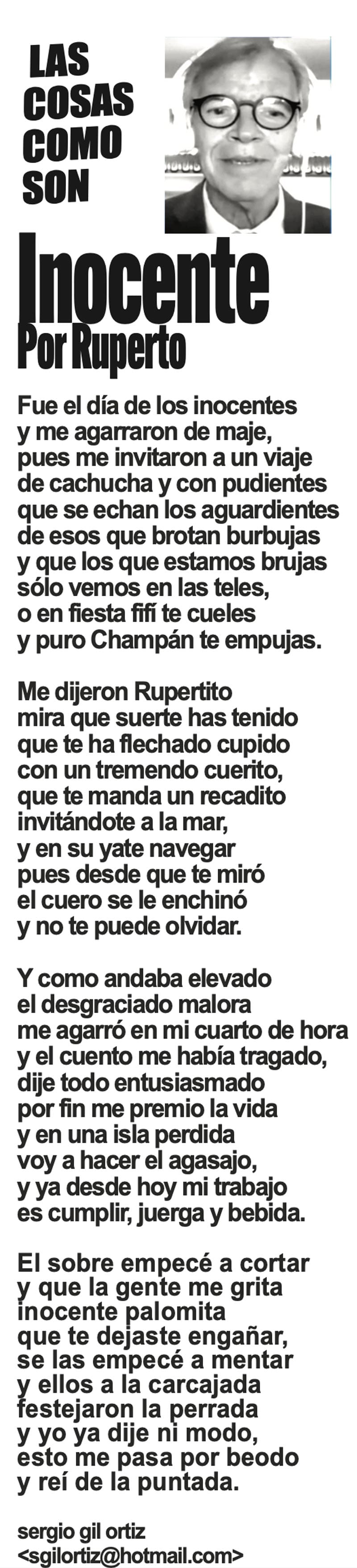 LAS COLUMNAS LAS COSAS COMO SON - INOCENTE INOCENTE... 28 diciembre 2023 Más Noticias CANCIONERO | EUTANASIA - Yo no tengo particular afecto por los animales llamados de compañía o mascotas, con las que seres solitarios procuran agenciarse afectos mediante el truco del perrito en el parque. Confieso que… A MIL POR HORA | - **Huérfanos mil niños **Hablar mal de Veracruz **Mesianismo jarocho **Fidel Castro en el café... SIN TACTO | SIGUE ZEPETA - En un despido que sigue el canon instaurado por la presidenta Claudia Sheinbaum, la dirigente nacional de Morena, Luisa María Alcalde Luján, fue invitada a ocupar la consejería jurídica de la Presidencia de la... TEXTO IRREVERENTE | ABRAZO FRATERNO - “Dios traerá con Jesús a los que se durmieron en Él” (1 Tesalonicenses 4:13). Desde acá va un abrazo solidario y fraterno para el periodista Luis Velásquez Rivera por la partida de su hermano... ACERTIJOS | LOS TIROTEOS EN LA TELE - Si uno llegara a conocer un nuevo país, suponiendo México, y comenzara a conocerlo y encendiera la tele para revisar el noticiero nocturno, qué bárbaro, pensarían que estamos en un campo de guerra y batalla... ACERTIJOS | LOS 100 AÑOS DE JULIO SCHERER - Julio Scherer García murió en 2015. La unanimidad, esa flor rara, rodeó sus funerales con la corona de la admiración. En estos días cumplió cien años de su nacimiento y la prensa recuperó algo de... A MIL POR HORA | - **Perfil de un mexicano **El jarocho patriota **La lengua más larga **Estilo Porfiriano... SIN TACTO | LA UV DISCRIMINA A JUAN JOSÉ BARRIENTOS - Juan José Barrientos es un ave de tempestades, como corresponde a todo escritor genial. En su larga, larguísima trayectoria literaria ha acumulado estudios y experiencia que se han adjuntado… TEXTO IRREVERENTE | FASCISMO ANTIHUERTISTA - Antes fue deducción, ahora es certeza. Desde el congreso local que dirige Esteban Bautista se financian asambleas y propaganda para denostar al senador Manuel Huerta. Es decir, se utiliza el... CANCIONERO | INTELIGENCIA - No me pidan que sustente la veracidad de lo que voy a escribir enseguida, porque no puedo hacerlo; tampoco voy a proporcionar fuentes de información fidedignas, ni pruebas documentales confiables. No me las pidan...