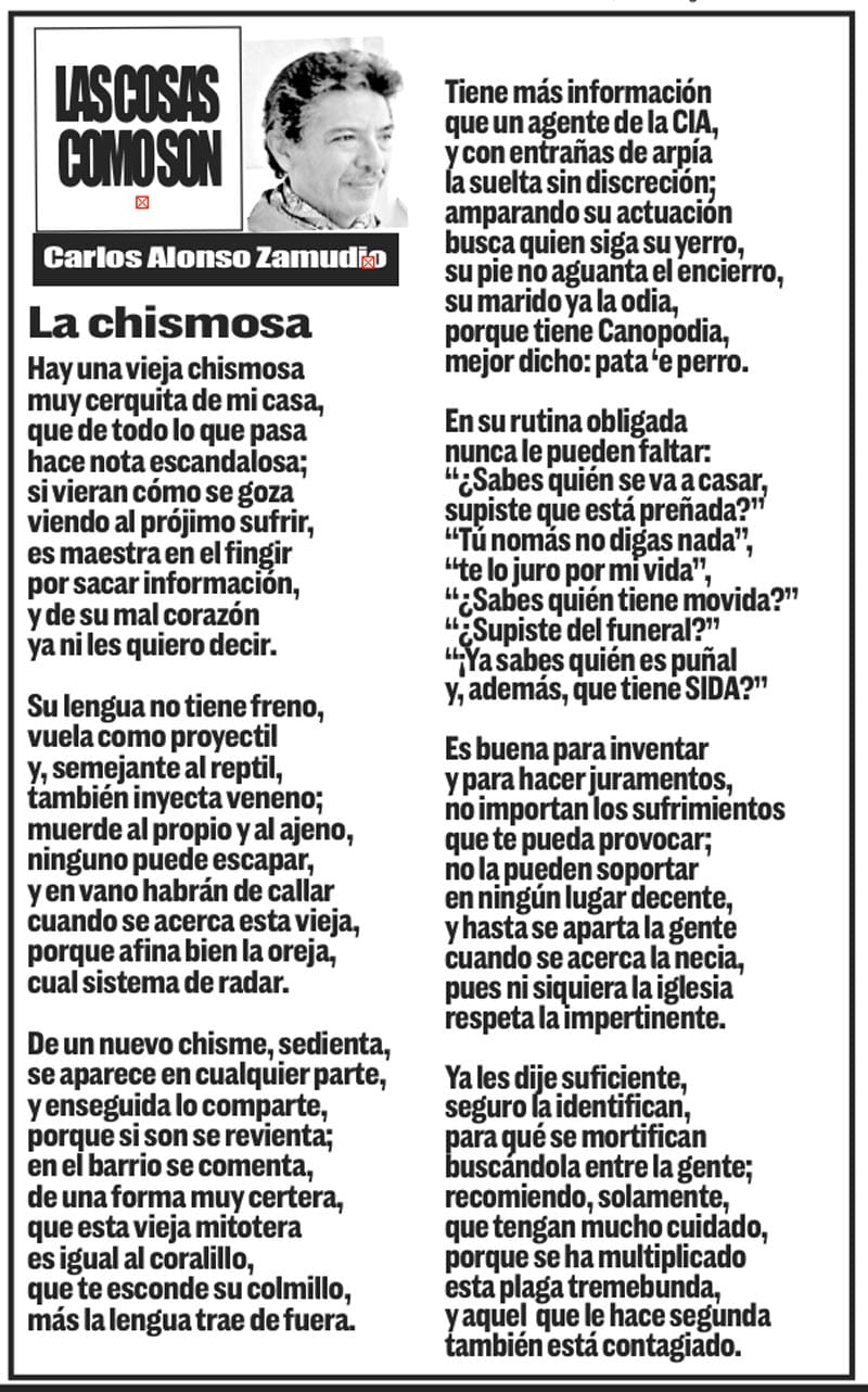 LAS COLUMNAS LAS COSAS COMO SON - LA CHISMOSA LA CHISMOSA... 22 octubre 2025 Más Noticias TEXTO IRREVERENTE | HISTORIAS NECESARIAS - “Cuando Woody tenía 2 años en la guardería les dijeron a sus padres que algo estaba mal, no respondía a las instrucciones básicas. Las pruebas demostraron que era autista grave”. Luego “los médicos… A MIL POR HORA | - **Grandes ilusiones **Peores políticos **Empleos en Veracruz **En misión periodística A MIL POR HORA | - **Historia de 5 casadas **Lucha vs demonios **Dedazo Porfirista **El fut como el SIDA TEXTO IRREVERENTE | NO ES CÁNDIDA - La conversación pública en Veracruz se puso sino interesante al menos contestataria. Los que saben del asunto dividen a la conversación pública en tres espacios principales -no los únicos, pero sí los… ACERTIJOS | LAS PRIMAVERAS CANTORAS - Tengo un jardín bien cuidado, diario lo espío y el jardinero que es de La Perla, Joel, como si fuera de Versalles, lo tiene rechinando de limpio. Hace años me ha dado por darles de comer, antes les tiraba… CANCIONERO | LA TERMINOLOGÍA - En el principio era el Verbo, y el Verbo era Dios.Y el Verbo era con Dios. Lo sigue siendo: las cosas existen dependiendo de nuestra capacidad de darles nombre. La comunicación no existiría sin la convención de que… SIN TACTO | MÁS DE ZEPETA - Un amigo que gravita en el ámbito de Morena se comunica conmigo y me dice que le pareció apegado a la realidad política lo que publiqué en el “Sin tacto” de ayer sobre la suerte previsible de Esteban Ramírez Zepeta y su… CANCIONERO | EUTANASIA - Yo no tengo particular afecto por los animales llamados de compañía o mascotas, con las que seres solitarios procuran agenciarse afectos mediante el truco del perrito en el parque. Confieso que… A MIL POR HORA | - **Huérfanos mil niños **Hablar mal de Veracruz **Mesianismo jarocho **Fidel Castro en el café... SIN TACTO | SIGUE ZEPETA - En un despido que sigue el canon instaurado por la presidenta Claudia Sheinbaum, la dirigente nacional de Morena, Luisa María Alcalde Luján, fue invitada a ocupar la consejería jurídica de la Presidencia de la...