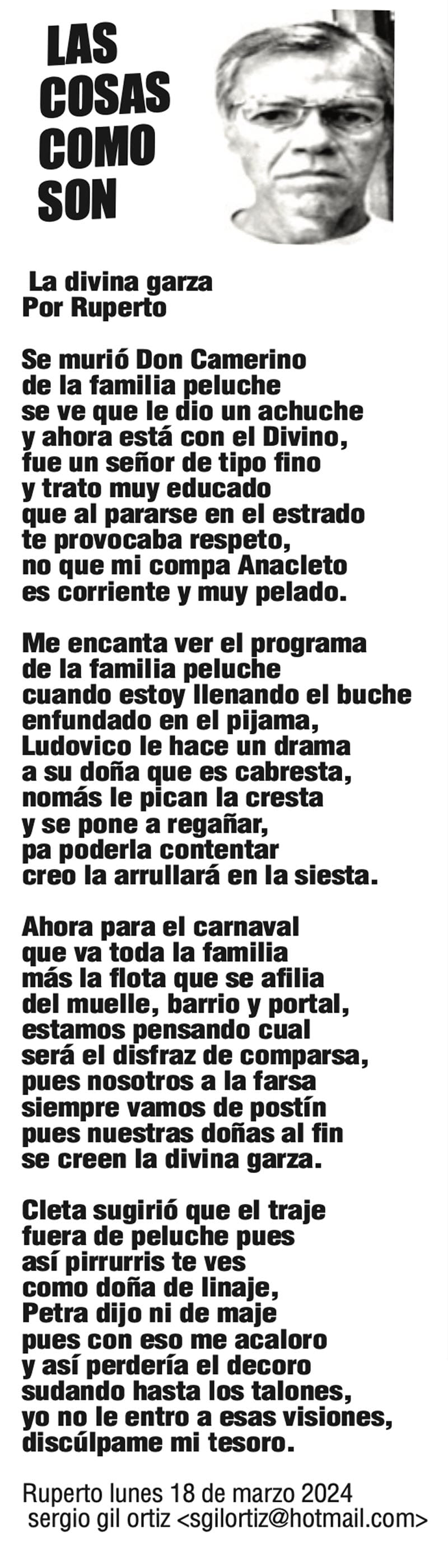 LAS COLUMNAS LAS COSAS COMO SON - | LA DIVINA GARZA LA DIVINA GARZA... 18 marzo 2024 Más Noticias LAS COSAS COMO SON | - MAS QUE UN DIARIO... TEXTO IRREVERENTE | LE VA A 'ECHAR GANITAS' - Al parecer, el asunto es 'chimoltrufiar' o sea lo mismo decir una cosa que otra. En marzo, el gobierno estatal informó que el programa de rehabilitación de carreteras y caminos conocido como "Bachetón"... ACERTIJOS | EL QUINTO PARTIDO - En la historia de los mundiales, México nunca ha jugado el quinto partido fuera de casa. Lo más que hemos alcanzado es el cuarto juego y de allí nos mandan a casa… A MIL POR HORA | - **Un matrimonio feliz **Apocalipsis jarocho **La isla de los pedófilos **“Amor con amor se paga”... A MIL POR HORA | - **Chicas más guapas **Días revolcados **Fascinantes artistas **Academia de Ególatras... CANCIONERO | EL PAN Y EL LLORO - Nada es accidental en la política. Este fin de semana, la señora presidente con A de patria tendrá una magna concentración de sus seguidores para celebrar el aniversario... TEXTO IRREVERENTE | ENNOCHEBUENADOS - La mercadotecnia adelanta todo y, ni modo, hay que lidiar con eso. Cuando todavía no acababa noviembre ya se vendían productos navideños y ahora mismo por doquiera se ven locales adornados con ese motivo... SIN TACTO | LAS VÍSPERAS - ¿Se acuerda la memorable lectora? ¿Recuerda el memorioso lector?: “Ya va llegando diciembre y sus posadas. Se va acercando ya también la Navidad. El año nuevo... LAS COSAS COMO SON - VAYA CINISMO... TEXTO IRREVERENTE | AÑO BUENO, AÑO MALO - El 2024 fue un año de suerte y abundancia. Este 2025 ha corrido en su contra con infortunio político y mediático. ¿‘Annus horribilis’? Tal vez no llega a tanto, pero sí desastroso y confirmatorio de sus...