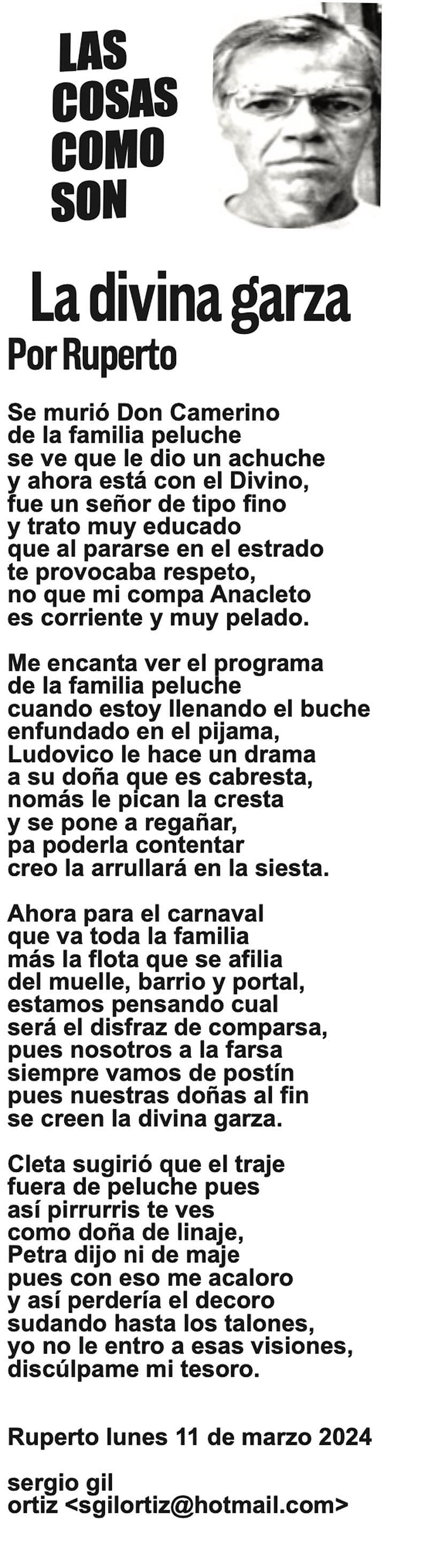LAS COLUMNAS LAS COSAS COMO SON - | LA DIVINA GARZA LA DIVINA GARZA... 11 marzo 2024 Más Noticias TEXTO IRREVERENTE | HISTORIAS NECESARIAS - “Cuando Woody tenía 2 años en la guardería les dijeron a sus padres que algo estaba mal, no respondía a las instrucciones básicas. Las pruebas demostraron que era autista grave”. Luego “los médicos… A MIL POR HORA | - **Grandes ilusiones **Peores políticos **Empleos en Veracruz **En misión periodística A MIL POR HORA | - **Historia de 5 casadas **Lucha vs demonios **Dedazo Porfirista **El fut como el SIDA TEXTO IRREVERENTE | NO ES CÁNDIDA - La conversación pública en Veracruz se puso sino interesante al menos contestataria. Los que saben del asunto dividen a la conversación pública en tres espacios principales -no los únicos, pero sí los… ACERTIJOS | LAS PRIMAVERAS CANTORAS - Tengo un jardín bien cuidado, diario lo espío y el jardinero que es de La Perla, Joel, como si fuera de Versalles, lo tiene rechinando de limpio. Hace años me ha dado por darles de comer, antes les tiraba… CANCIONERO | LA TERMINOLOGÍA - En el principio era el Verbo, y el Verbo era Dios.Y el Verbo era con Dios. Lo sigue siendo: las cosas existen dependiendo de nuestra capacidad de darles nombre. La comunicación no existiría sin la convención de que… SIN TACTO | MÁS DE ZEPETA - Un amigo que gravita en el ámbito de Morena se comunica conmigo y me dice que le pareció apegado a la realidad política lo que publiqué en el “Sin tacto” de ayer sobre la suerte previsible de Esteban Ramírez Zepeta y su… CANCIONERO | EUTANASIA - Yo no tengo particular afecto por los animales llamados de compañía o mascotas, con las que seres solitarios procuran agenciarse afectos mediante el truco del perrito en el parque. Confieso que… A MIL POR HORA | - **Huérfanos mil niños **Hablar mal de Veracruz **Mesianismo jarocho **Fidel Castro en el café... SIN TACTO | SIGUE ZEPETA - En un despido que sigue el canon instaurado por la presidenta Claudia Sheinbaum, la dirigente nacional de Morena, Luisa María Alcalde Luján, fue invitada a ocupar la consejería jurídica de la Presidencia de la...