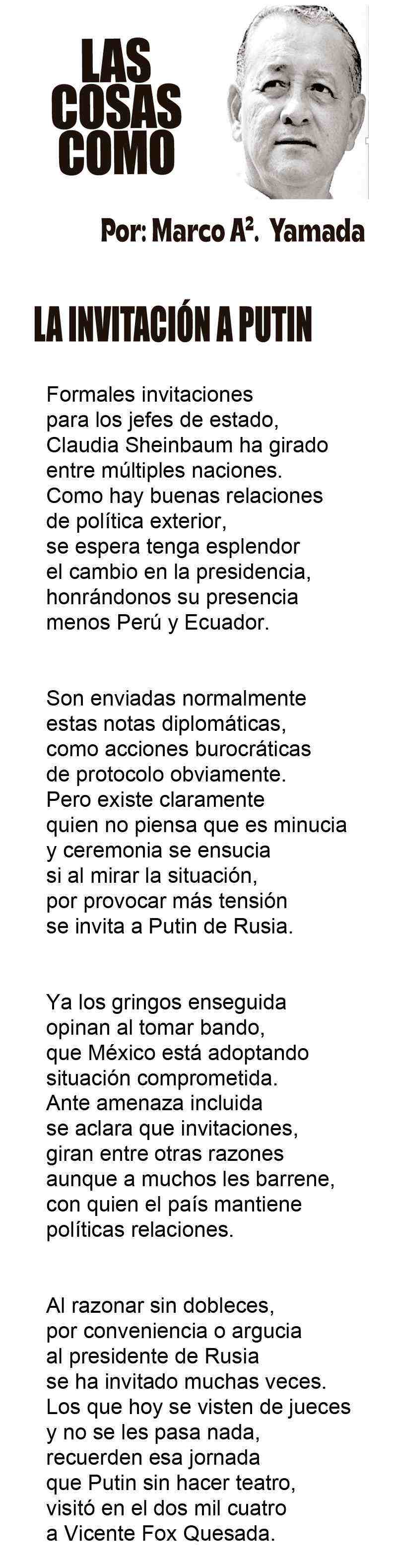 LAS COLUMNAS LAS COSAS COMO SON | - LA INVITACIÓN A PUTÍN LA INVITACIÓN A PUTÍN... 10 agosto 2024 Más Noticias CANCIONERO | PIRATAS DEL CARIBE - A la pregunta de qué va a hacer con el petróleo que llevaba el barco tanque grandote llamado Skipper y con bandera falsa de Guyana, que sus fuerzas armadas... ACERTIJOS | LOS 51 AÑOS DE NOTIVER - Allá por los años 70s nacía Notiver. Un día Guadalupano por un asunto de festejo familiar. Desde aquel día de hace 51 años, que este 12 de diciembre se cumplen, el diario... TEXTO IRREVERENTE | - Monumental, mágico, misterioso y meritorio. Así definen arqueólogos y antropólogos a El Tajín, la ciudad prehispánica que se ubica cerca de Papantla, al norte veracruzano... A MIL POR HORA | - **Los duendes existen **Honrar al IMSS **Comadrita traviesa **Javier Duarte seguirá preso... TEXTO IRREVERENTE | CINCUENTA + UNO - La familia notiveriana está velando vísperas pues mañana es su fiesta magna, la que tiene lugar cada fin de otoño, ya pisando el invierno. El cumpleaños de NOTIVER comparte fecha... CANCIONERO | EL GOZO AL POZO...DE AGUA - Muy pronto se apagó el argüende mediático armado desde Palacio Nacional, en torno a la señora presidente con A de patria, celebrando con sonrisa pareja del primer ministro de Canadá, el bailoteo al ritmo de YMCA... SIN TACTO | 4T, LAS CUENTAS ALEGRES - Bueno, cuando menos podemos aceptar que los morenos en el poder tienen una capacidad: seguir al pie de la letra las instrucciones del librito que indica cómo responder y qué decir… ACERTIJOS | POR LOS 51 DE NOTIVER - Un día antes auguraban un gran Norte, que entró en lunes. Al iniciar semana. Cotidianamente llegó con mi hermano Enrique, con Fernando Pavón, biógrafo de Tierra Blanca y el amigo... 51 Y CONTANDO… | - Medio siglo y un año, no se escribe ni fácil ni sin derramar una que otra lagrimilla: 51 años de éste su periódico NOTIVER. La Noticia en el momento que sucede, es un acontecimiento más... A MIL POR HORA | - **Migrante exitoso **Genio universal **Manipulador de mujeres **Ley vs vapeadores...