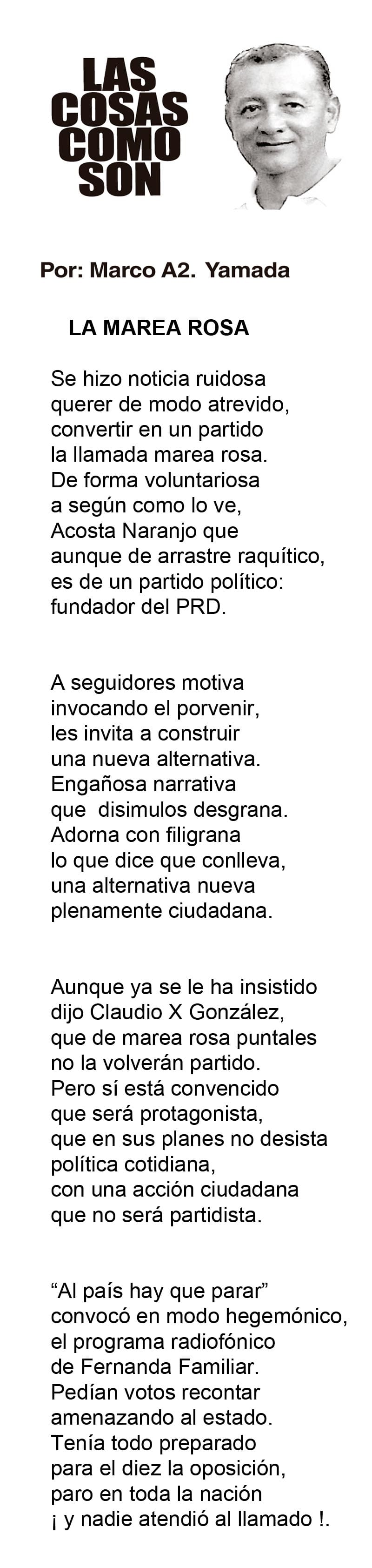 LAS COLUMNAS LAS COSAS COMO SON | - LA MAREA ROSA LA MAREA ROSA... 15 junio 2024 Más Noticias TEXTO IRREVERENTE | UN ARTE ETERNO - Envejecer haciendo periodismo no es sinónimo de obsolescencia ni de ser retardatario. La llamada ‘vieja guardia’ de la reporteada y del análisis periodístico... DIARIO DE UN REPORTERO | Y TODO ¿PARA QUÉ? - Tres días estuvo cerrado el centro de Xalapa porque se preparaba el escenario para el primer informe de la gobernadora Rocío Nahle. El tránsito... ACERTIJOS | NACEN LOS RIVALES EN FIFA - Es la mañana del sorteo de FIFA, en Washington, que amanece con un frio del carajo a 2 grados bajo cero y con caída de nieve. Llegan al Kennedy Center… A MIL POR HORA | - **5 películas icónicas **Seniles: bailar en casa **Marilyn y Chanel 5 **Sabroso quesito fundido... LAS COSAS COMO SON | - MAS QUE UN DIARIO... TEXTO IRREVERENTE | LE VA A 'ECHAR GANITAS' - Al parecer, el asunto es 'chimoltrufiar' o sea lo mismo decir una cosa que otra. En marzo, el gobierno estatal informó que el programa de rehabilitación de carreteras y caminos conocido como "Bachetón"... ACERTIJOS | EL QUINTO PARTIDO - En la historia de los mundiales, México nunca ha jugado el quinto partido fuera de casa. Lo más que hemos alcanzado es el cuarto juego y de allí nos mandan a casa… A MIL POR HORA | - **Un matrimonio feliz **Apocalipsis jarocho **La isla de los pedófilos **“Amor con amor se paga”... A MIL POR HORA | - **Chicas más guapas **Días revolcados **Fascinantes artistas **Academia de Ególatras... CANCIONERO | EL PAN Y EL LLORO - Nada es accidental en la política. Este fin de semana, la señora presidente con A de patria tendrá una magna concentración de sus seguidores para celebrar el aniversario...