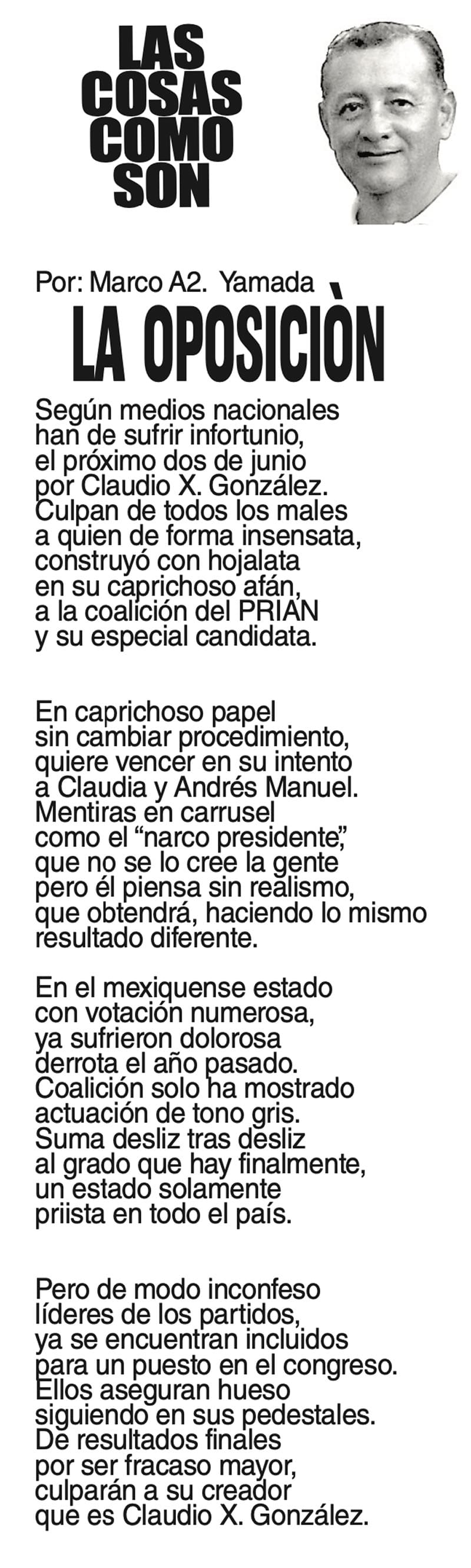LAS COLUMNAS LAS COSAS COMO SON | - LA OPOSICIÓN LA OPOSICIÓN... 30 mayo 2024 Más Noticias LAS COSAS COMO SON | - MAS QUE UN DIARIO... TEXTO IRREVERENTE | LE VA A 'ECHAR GANITAS' - Al parecer, el asunto es 'chimoltrufiar' o sea lo mismo decir una cosa que otra. En marzo, el gobierno estatal informó que el programa de rehabilitación de carreteras y caminos conocido como "Bachetón"... ACERTIJOS | EL QUINTO PARTIDO - En la historia de los mundiales, México nunca ha jugado el quinto partido fuera de casa. Lo más que hemos alcanzado es el cuarto juego y de allí nos mandan a casa… A MIL POR HORA | - **Un matrimonio feliz **Apocalipsis jarocho **La isla de los pedófilos **“Amor con amor se paga”... A MIL POR HORA | - **Chicas más guapas **Días revolcados **Fascinantes artistas **Academia de Ególatras... CANCIONERO | EL PAN Y EL LLORO - Nada es accidental en la política. Este fin de semana, la señora presidente con A de patria tendrá una magna concentración de sus seguidores para celebrar el aniversario... TEXTO IRREVERENTE | ENNOCHEBUENADOS - La mercadotecnia adelanta todo y, ni modo, hay que lidiar con eso. Cuando todavía no acababa noviembre ya se vendían productos navideños y ahora mismo por doquiera se ven locales adornados con ese motivo... SIN TACTO | LAS VÍSPERAS - ¿Se acuerda la memorable lectora? ¿Recuerda el memorioso lector?: “Ya va llegando diciembre y sus posadas. Se va acercando ya también la Navidad. El año nuevo... LAS COSAS COMO SON - VAYA CINISMO... TEXTO IRREVERENTE | AÑO BUENO, AÑO MALO - El 2024 fue un año de suerte y abundancia. Este 2025 ha corrido en su contra con infortunio político y mediático. ¿‘Annus horribilis’? Tal vez no llega a tanto, pero sí desastroso y confirmatorio de sus...
