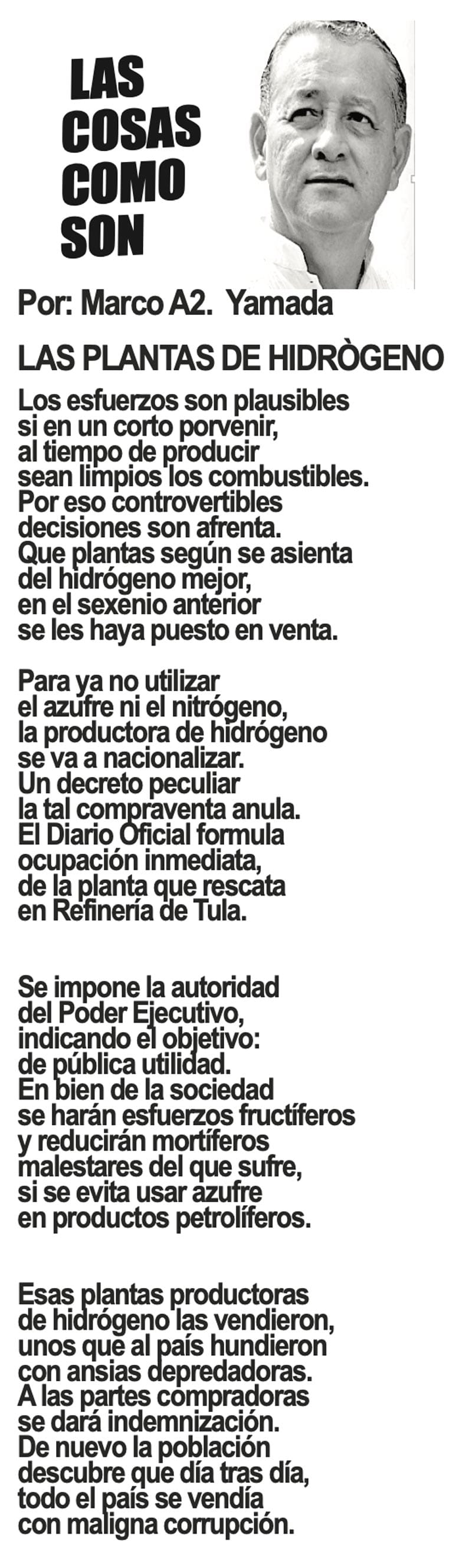 LAS COLUMNAS LAS COSAS COMO SON - LAS PLANTAS DE HIDRÓGENO LAS PLANTAS DE HIDRÓGENO... 2 enero 2024 Más Noticias ACERTIJOS | LOS 100 AÑOS DE JULIO SCHERER - Julio Scherer García murió en 2015. La unanimidad, esa flor rara, rodeó sus funerales con la corona de la admiración. En estos días cumplió cien años de su nacimiento y la prensa recuperó algo de... A MIL POR HORA | - **Perfil de un mexicano **El jarocho patriota **La lengua más larga **Estilo Porfiriano... SIN TACTO | LA UV DISCRIMINA A JUAN JOSÉ BARRIENTOS - Juan José Barrientos es un ave de tempestades, como corresponde a todo escritor genial. En su larga, larguísima trayectoria literaria ha acumulado estudios y experiencia que se han adjuntado… TEXTO IRREVERENTE | FASCISMO ANTIHUERTISTA - Antes fue deducción, ahora es certeza. Desde el congreso local que dirige Esteban Bautista se financian asambleas y propaganda para denostar al senador Manuel Huerta. Es decir, se utiliza el... CANCIONERO | INTELIGENCIA - No me pidan que sustente la veracidad de lo que voy a escribir enseguida, porque no puedo hacerlo; tampoco voy a proporcionar fuentes de información fidedignas, ni pruebas documentales confiables. No me las pidan... CANCIONERO | CANDIL DE LA CALLE - Ya corrió bastante tinta, inclusive en este espacio, reconociendo la simplemente digna conducta de la señora presidente con A de mujer durante sus muy publicitadas apariciones en su breve visita a Barcelona y... ACERTIJOS | DOS MUJERES. DOS PASIONES - Dos mujeres que piensan diferente y que, quizá estarán en trincheras opositoras. Una ya gobierna un país grande, México, la otra va a ser pronto la presidenta de Venezuela, en cuanto se ponga más quieto aquel... TEXTO IRREVERENTE | EN TRES ACTOS - Primer acto. Miguel Ángel Anaya Castillo, periodista independiente y dueño del portal informativo “Pánuco On Line” incomoda al poder municipal por reportar los abusos de poder y andanas insanas del alcalde… A MIL POR HORA | - **El mundo animal… **Retrato de Veracruz **Jarocho de Jack London **Lo mejor y peor del día... SIN TACTO | LA BRONCA EN SALUD ESTATAL - Son 26 mil trabajadores los que tiene en Veracruz el sector Salud y son ellos mismos los que están en un movimiento activo para exigir sus derechos no cumplidos y que se ponga la atención debida a los servicios...