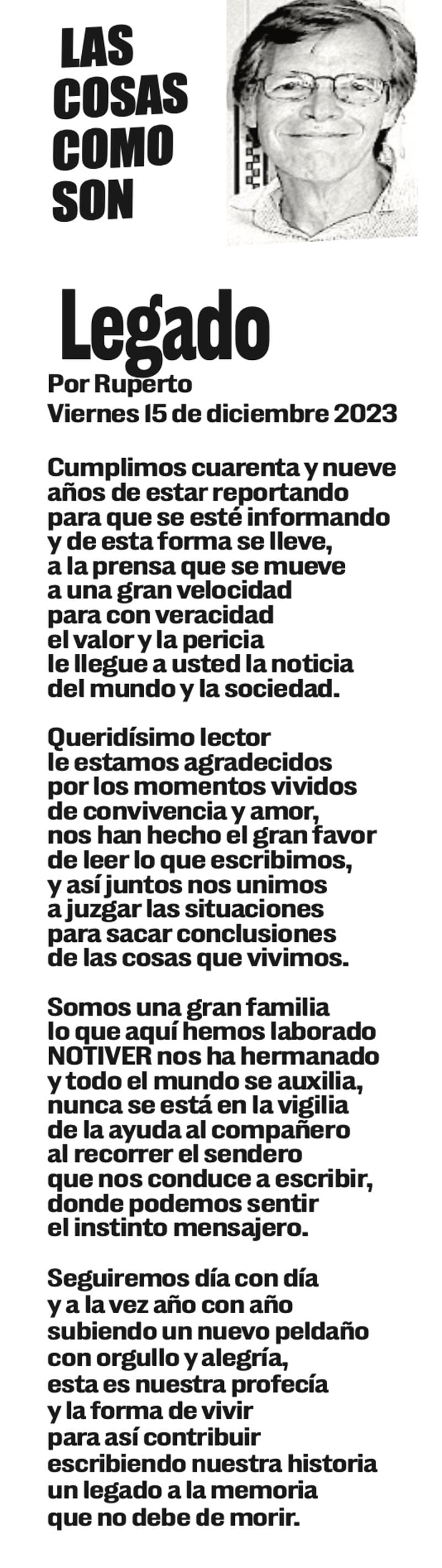 LAS COLUMNAS LAS COSAS COMO SON - LEGADO LEGADO... 15 diciembre 2023 Más Noticias TEXTO IRREVERENTE | UN ARTE ETERNO - Envejecer haciendo periodismo no es sinónimo de obsolescencia ni de ser retardatario. La llamada ‘vieja guardia’ de la reporteada y del análisis periodístico... DIARIO DE UN REPORTERO | Y TODO ¿PARA QUÉ? - Tres días estuvo cerrado el centro de Xalapa porque se preparaba el escenario para el primer informe de la gobernadora Rocío Nahle. El tránsito... ACERTIJOS | NACEN LOS RIVALES EN FIFA - Es la mañana del sorteo de FIFA, en Washington, que amanece con un frio del carajo a 2 grados bajo cero y con caída de nieve. Llegan al Kennedy Center… A MIL POR HORA | - **5 películas icónicas **Seniles: bailar en casa **Marilyn y Chanel 5 **Sabroso quesito fundido... LAS COSAS COMO SON | - MAS QUE UN DIARIO... TEXTO IRREVERENTE | LE VA A 'ECHAR GANITAS' - Al parecer, el asunto es 'chimoltrufiar' o sea lo mismo decir una cosa que otra. En marzo, el gobierno estatal informó que el programa de rehabilitación de carreteras y caminos conocido como "Bachetón"... ACERTIJOS | EL QUINTO PARTIDO - En la historia de los mundiales, México nunca ha jugado el quinto partido fuera de casa. Lo más que hemos alcanzado es el cuarto juego y de allí nos mandan a casa… A MIL POR HORA | - **Un matrimonio feliz **Apocalipsis jarocho **La isla de los pedófilos **“Amor con amor se paga”... A MIL POR HORA | - **Chicas más guapas **Días revolcados **Fascinantes artistas **Academia de Ególatras... CANCIONERO | EL PAN Y EL LLORO - Nada es accidental en la política. Este fin de semana, la señora presidente con A de patria tendrá una magna concentración de sus seguidores para celebrar el aniversario...