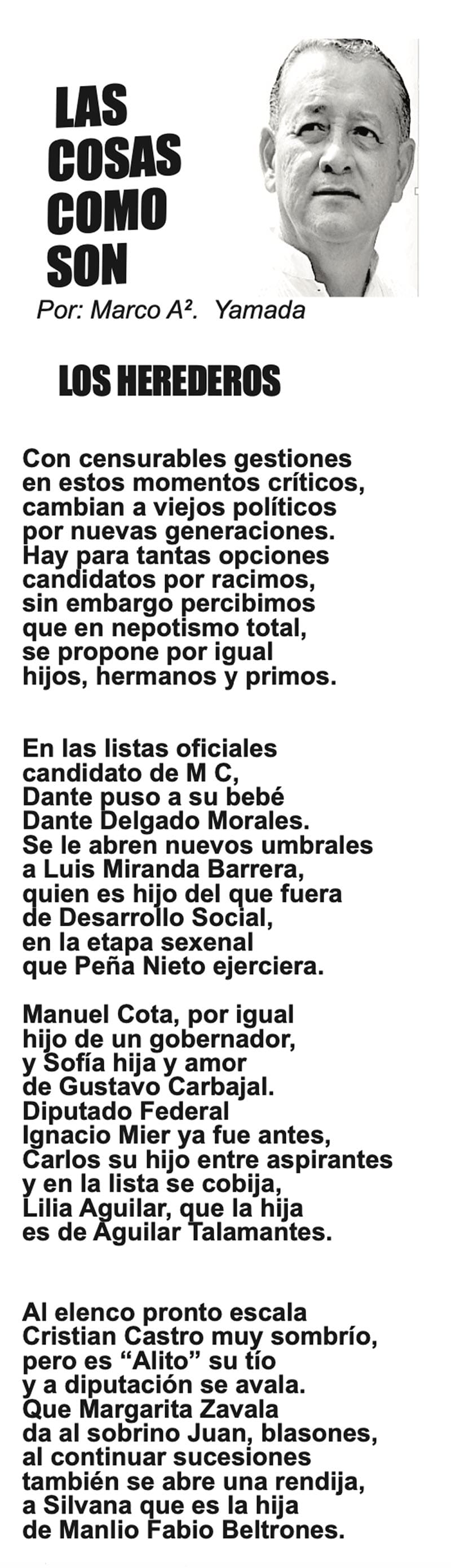 LAS COLUMNAS LAS COSAS COMO SON | - LOS HEREDEROS LOS HEREDEROS... 24 febrero 2024 Más Noticias LAS COSAS COMO SON | - MAS QUE UN DIARIO... TEXTO IRREVERENTE | LE VA A 'ECHAR GANITAS' - Al parecer, el asunto es 'chimoltrufiar' o sea lo mismo decir una cosa que otra. En marzo, el gobierno estatal informó que el programa de rehabilitación de carreteras y caminos conocido como "Bachetón"... ACERTIJOS | EL QUINTO PARTIDO - En la historia de los mundiales, México nunca ha jugado el quinto partido fuera de casa. Lo más que hemos alcanzado es el cuarto juego y de allí nos mandan a casa… A MIL POR HORA | - **Un matrimonio feliz **Apocalipsis jarocho **La isla de los pedófilos **“Amor con amor se paga”... A MIL POR HORA | - **Chicas más guapas **Días revolcados **Fascinantes artistas **Academia de Ególatras... CANCIONERO | EL PAN Y EL LLORO - Nada es accidental en la política. Este fin de semana, la señora presidente con A de patria tendrá una magna concentración de sus seguidores para celebrar el aniversario... TEXTO IRREVERENTE | ENNOCHEBUENADOS - La mercadotecnia adelanta todo y, ni modo, hay que lidiar con eso. Cuando todavía no acababa noviembre ya se vendían productos navideños y ahora mismo por doquiera se ven locales adornados con ese motivo... SIN TACTO | LAS VÍSPERAS - ¿Se acuerda la memorable lectora? ¿Recuerda el memorioso lector?: “Ya va llegando diciembre y sus posadas. Se va acercando ya también la Navidad. El año nuevo... LAS COSAS COMO SON - VAYA CINISMO... TEXTO IRREVERENTE | AÑO BUENO, AÑO MALO - El 2024 fue un año de suerte y abundancia. Este 2025 ha corrido en su contra con infortunio político y mediático. ¿‘Annus horribilis’? Tal vez no llega a tanto, pero sí desastroso y confirmatorio de sus...